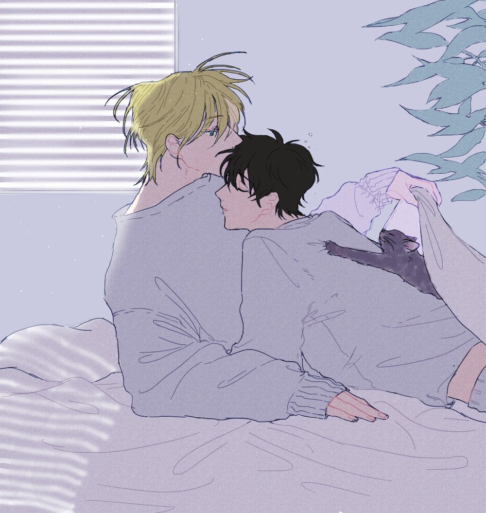 2boys a_co_pi animal arm_up ash_lynx banana_fish black_cat black_hair blanket blonde_hair blue_eyes cat closed_eyes closed_mouth commentary_request from_side grey_sweater holding holding_blanket indoors lying male_focus multiple_boys okumura_eiji on_person parted_bangs plant sleeves_past_wrists sweater under_covers window_blinds yaoi