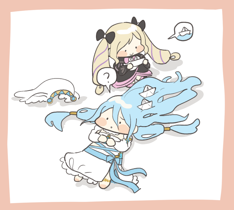 2girls ? azura_(fire_emblem) blonde_hair confused ddomy_pangin elise_(fire_emblem) fire_emblem fire_emblem_fates long_hair multicolored_hair multiple_girls nintendo paper_boat purple_hair speech_bubble streaked_hair twintails unworn_headwear very_long_hair water