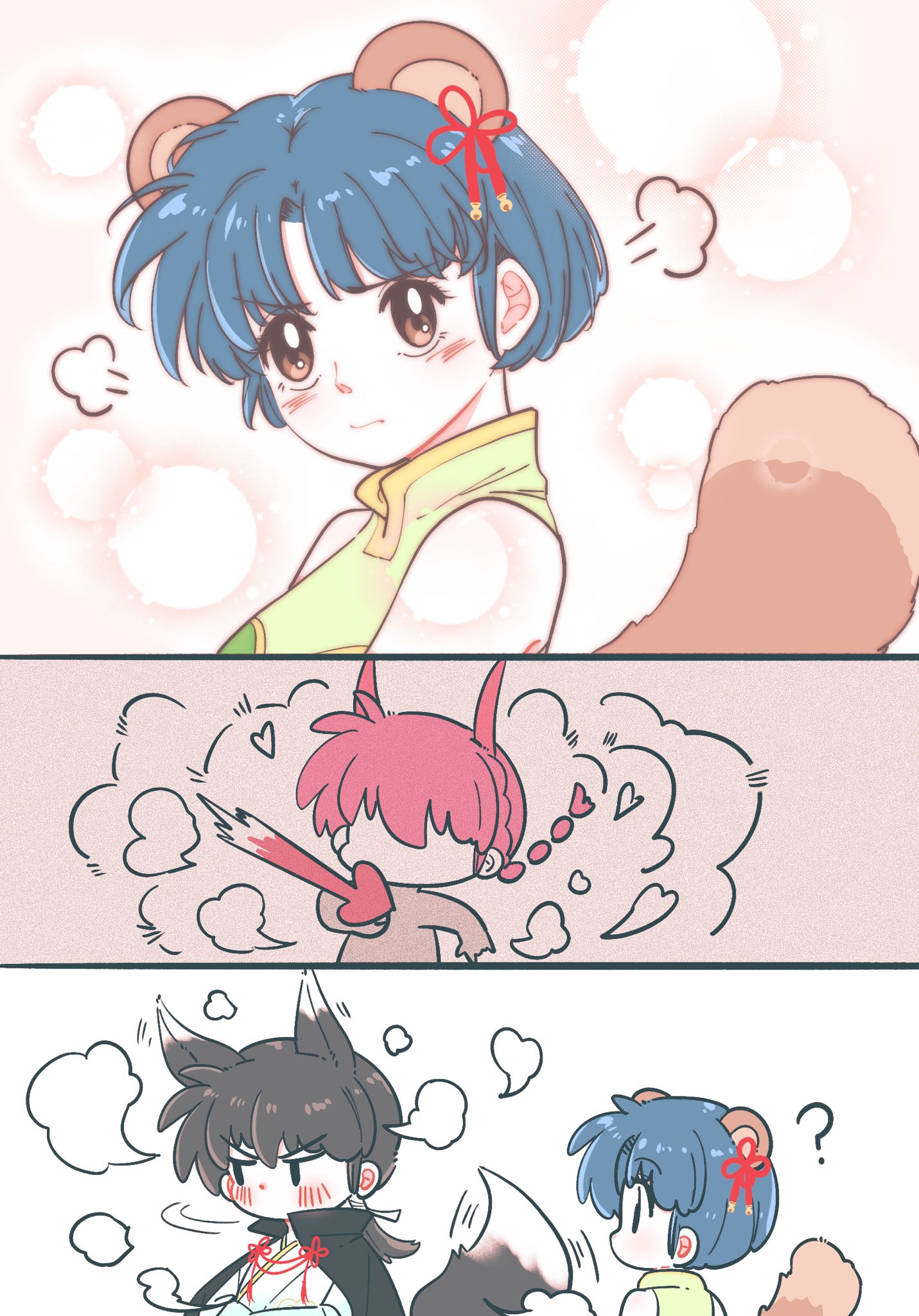 1boy 2girls ? akarinaakari animal_ears black_cape black_hair blue_hair blush braid brown_eyes cape chibi closed_mouth commentary fox_boy fox_ears fox_tail heart hetero highres horns kemonomimi_mode low_ponytail multiple_girls oni pink_eyes pink_hair pink_horns ponytail raccoon_ears raccoon_girl raccoon_tail ranma-chan ranma_1/2 saotome_ranma short_hair single_braid tail tendou_akane untranslatable_commentary v-shaped_eyebrows yuri