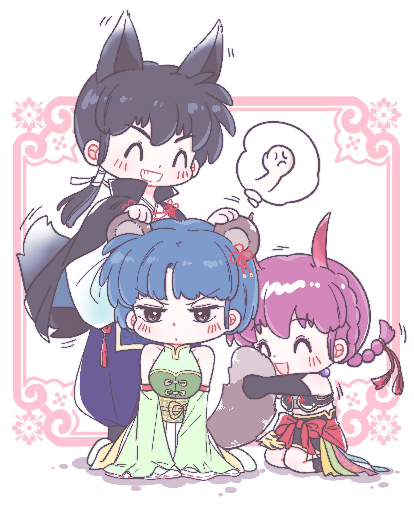 1boy 2girls ^_^ akarinaakari animal_ears bare_shoulders black_cape black_gloves black_hair blue_hair braid cape chibi closed_eyes closed_mouth commentary dress fox_boy fox_ears fox_tail gloves green_dress grin highres horns hugging_tail kemonomimi_mode low_ponytail multiple_girls oni open_mouth petting pink_background pink_eyes pink_hair ponytail raccoon_ears raccoon_girl raccoon_tail ranma-chan ranma_1/2 red_horns saotome_ranma short_hair single_braid sitting smile speech_bubble tail tendou_akane thought_bubble untranslatable_commentary