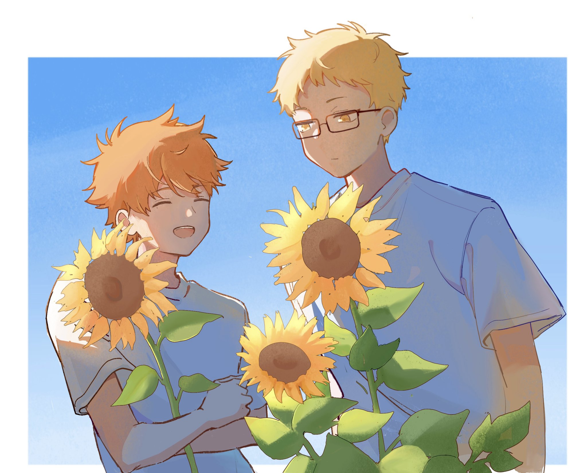 2boys black-framed_eyewear blonde_hair blue_sky border closed_eyes closed_mouth flower glasses haikyuu!! height_difference highres hinata_shouyou huihui2114 looking_at_another male_focus multiple_boys open_mouth orange_hair outside_border rectangular_eyewear shirt short_hair sky sunflower tsukishima_kei white_border white_shirt yellow_eyes