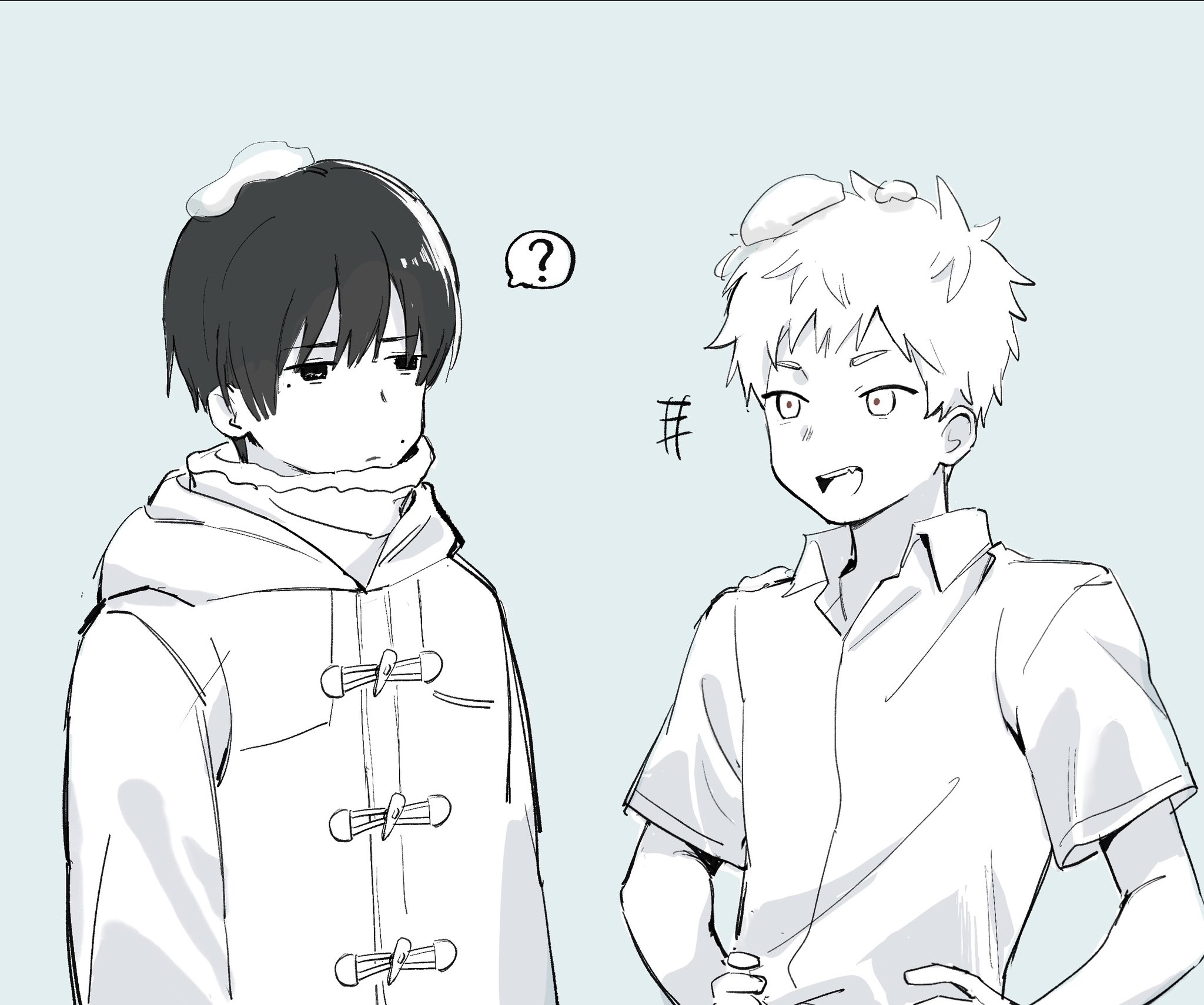 2boys ? closed_mouth coat collared_shirt crooked_teeth duffel_coat greyscale hands_on_another's_hips highres hikaru_ga_shinda_natsu huihui2114 indou_hikaru looking_at_another male_focus mole mole_on_cheek mole_under_eye mole_under_mouth monochrome multiple_boys open_mouth shirt short_sleeves snow_on_head spoken_question_mark tsujinaka_yoshiki upper_body
