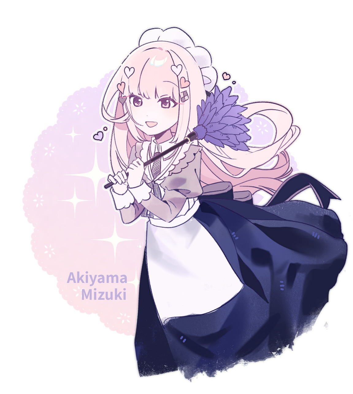 1other akiyama_mizuki apron back_bow blue_skirt bow character_name checkerboard_cookie checkerboard_cookie_hair_ornament chinese_commentary collared_shirt commentary_request cookie cookie_hair_ornament cropped_legs dot_nose duster feather_duster food food-themed_hair_ornament frilled_shirt frilled_sleeves frills funsai_seyo!_unvalentine_no_fukushuu_(project_sekai) gradient_background grey_shirt hair_ornament heart heart_hair_ornament highres holding holding_duster juliet_sleeves laylayhappy long_hair long_skirt long_sleeves maid_headdress official_alternate_costume official_alternate_hair_length official_alternate_hairstyle other_focus outline pink_background pink_eyes pink_hair project_sekai puffy_sleeves purple_background shirt skirt solo sparkle upper_body white_apron white_background white_outline