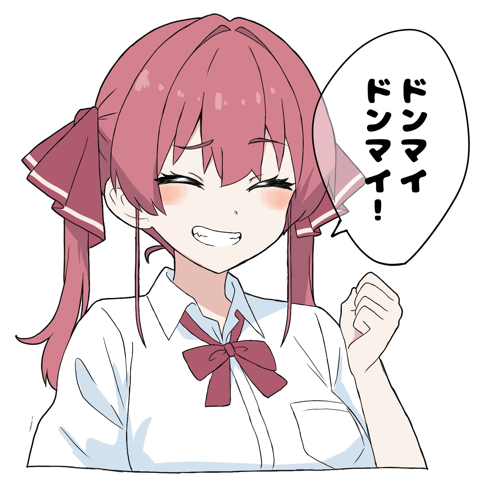1girl blush bow breasts closed_eyes collared_shirt commentary_request hair_ribbon highres hololive houshou_marine kounamuya large_breasts medium_hair parted_lips portrait red_bow red_hair ribbon shirt simple_background smile solo translation_request twintails virtual_youtuber white_background white_shirt
