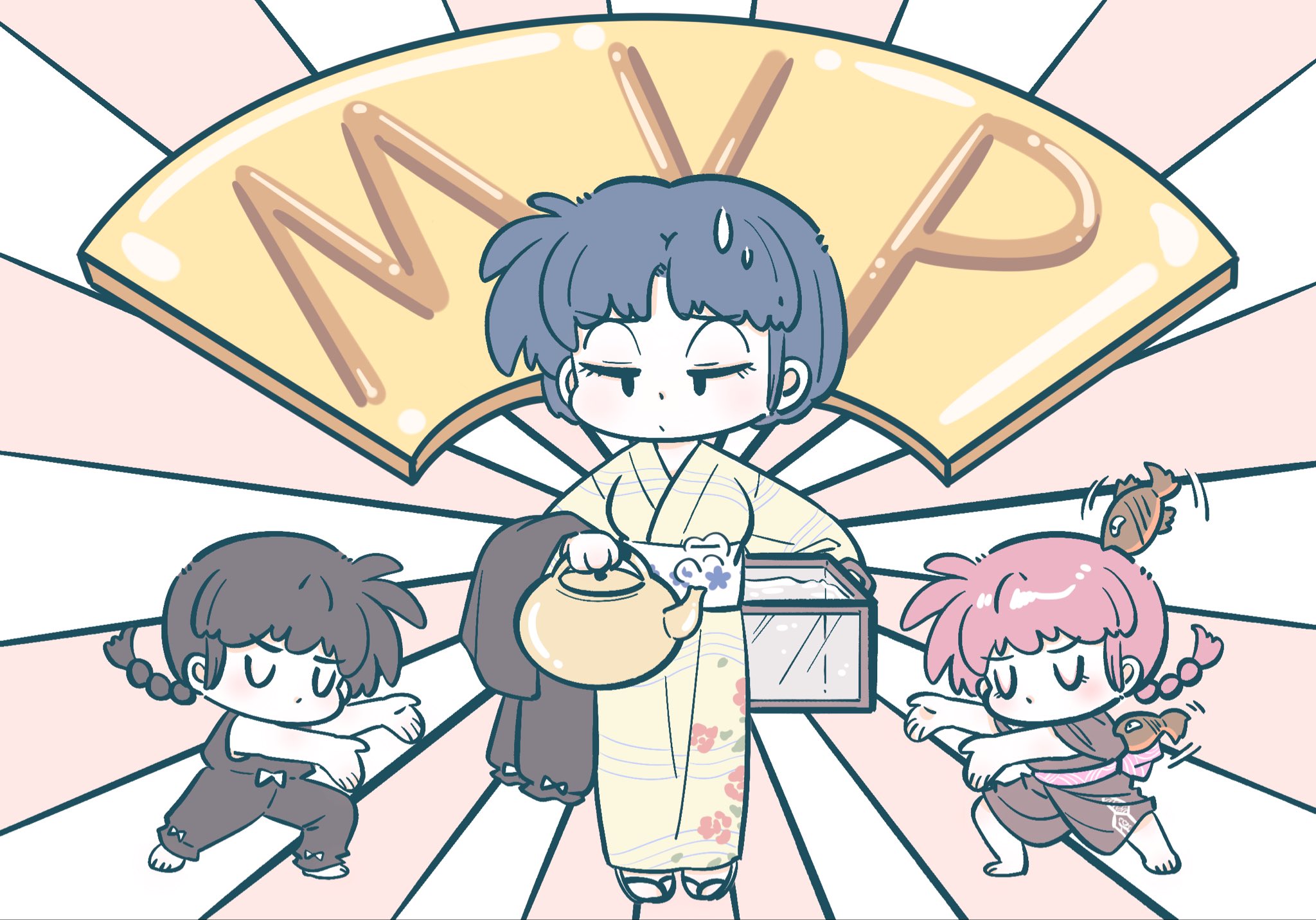 1boy 2girls akarinaakari barefoot blue_hair braid brown_hair chibi closed_eyes closed_mouth commentary_request fish half-closed_eyes highres holding holding_teapot japanese_clothes kimono multiple_girls ranma-chan ranma_1/2 sandals saotome_ranma short_hair single_braid sweatdrop teapot tendou_akane yellow_kimono