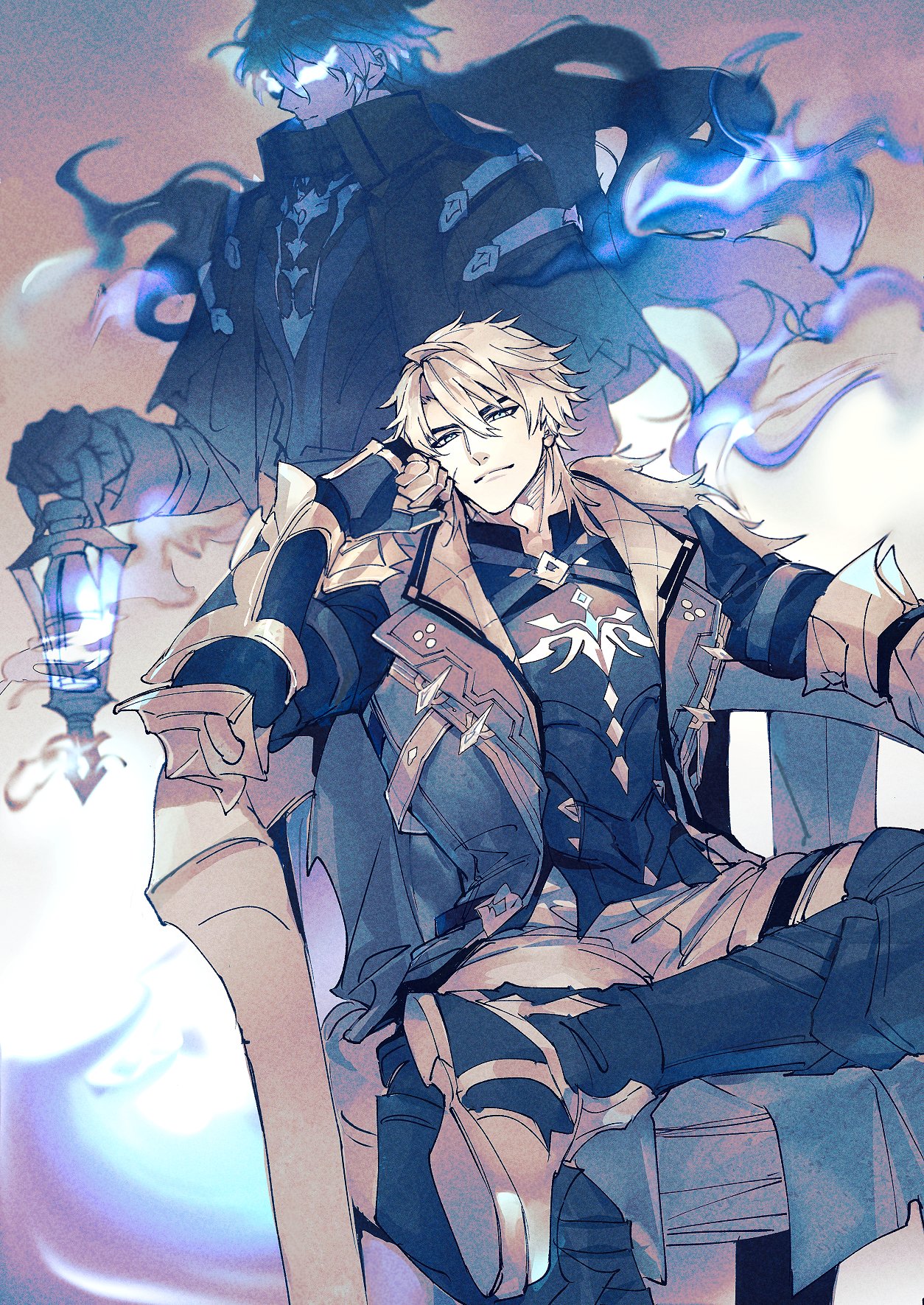 2boys abyssosque12 arm_rest armor behind_another blue_fire boots breastplate bridal_gauntlets capelet chair closed_mouth coat commentary_request elbow_rest facial_scar fire flaming_eyes flins_(genshin_impact) floating_hair genshin_impact gloves hair_between_eyes hand_on_own_cheek hand_on_own_face head_tilt highres holding holding_lantern lantern light_smile long_hair long_sleeves looking_ahead looking_at_viewer male_focus medium_hair multiple_boys on_chair open_clothes open_coat pants pauldrons scar scar_on_cheek scar_on_face shoulder_armor single_pauldron sitting varka_(genshin_impact) very_long_hair