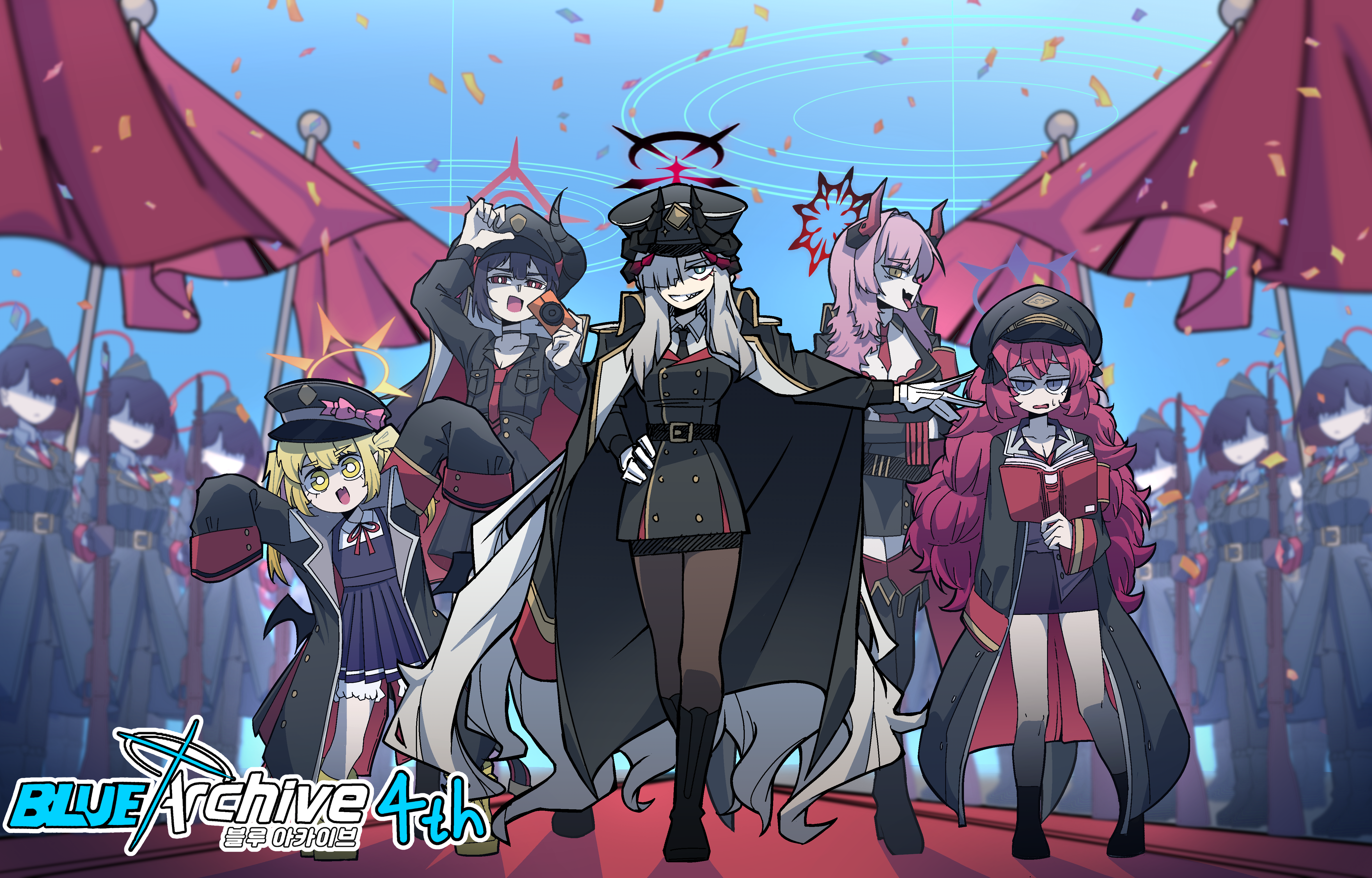 absurdres blonde_hair blue_archive chiaki_(blue_archive) commentary_request hat highres ibuki_(blue_archive) iroha_(blue_archive) korean_commentary long_hair makoto_(blue_archive) mulsae multiple_girls necktie pandemonium_society_(blue_archive) peaked_cap pink_hair red_hair satsuki_(blue_archive) short_hair white_hair