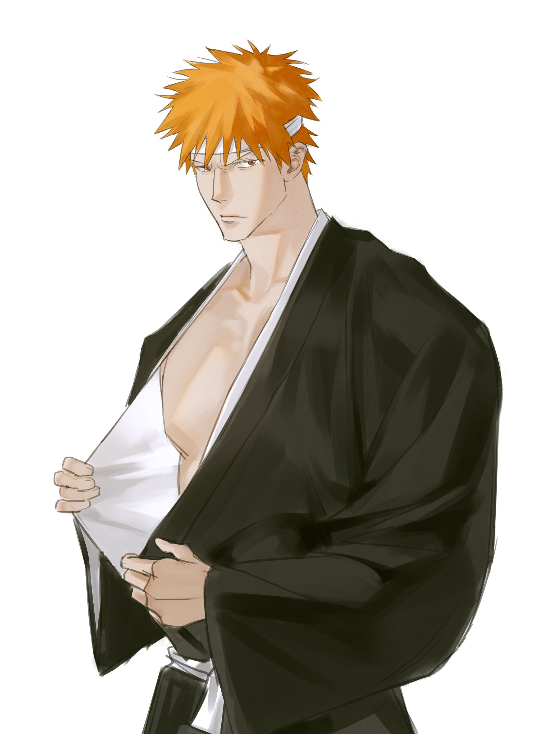 1boy absurdres bandaged_head bandages bleach closed_mouth highres kurosaki_ichigo looking_at_viewer male_focus no_nipples orange_eyes orange_hair pectorals shihakusho short_hair simple_background solo spiked_hair white_background xatavo9919