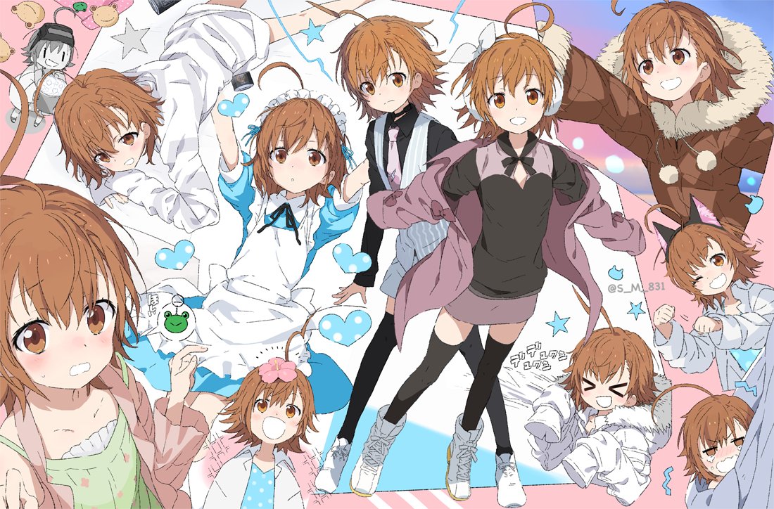 1girl ;d accelerator_(toaru_majutsu_no_index) accelerator_(toaru_majutsu_no_index)_(cosplay) ahoge animal_ears black_thighhighs brown_eyes brown_hair cat_ears child coat commentary cosplay dress formal_clothes full_body gekota hat jacket lab_coat last_order_(toaru_majutsu_no_index) long_sleeves looking_ahead looking_at_viewer medium_hair multiple_views necktie nurse nurse_cap nurse_dress one_eye_closed open_clothes open_jacket open_mouth oversized_clothes polka_dot polka_dot_dress s_m_831 sitting skirt smile standing suit thighhighs toaru_majutsu_no_index toaru_majutsu_no_index:_genesis_testament toaru_majutsu_no_index:_old_testament untranslatable_commentary variations white_polka_dots winter_clothes