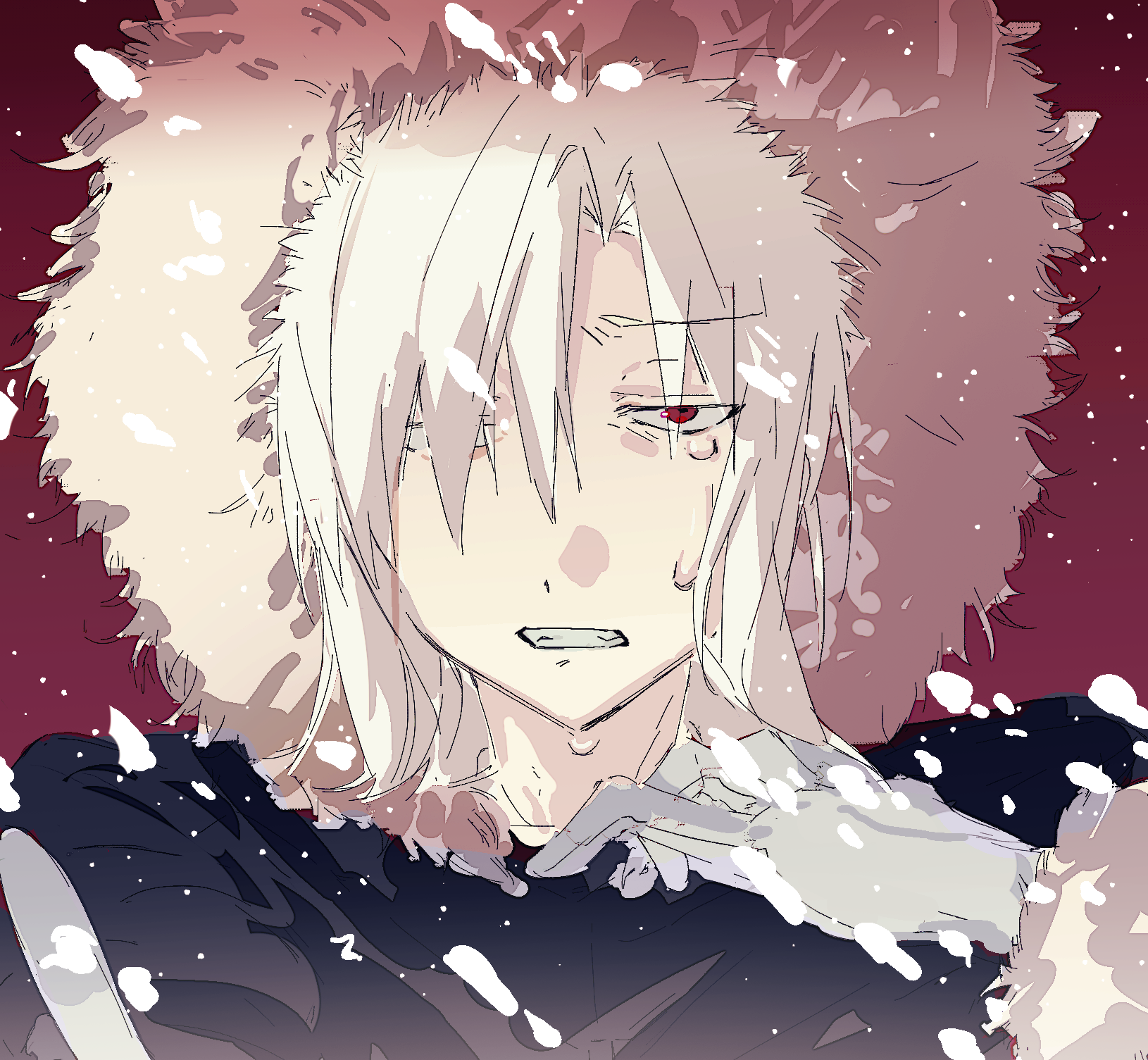 adipocere_(vocaloid) black_coat chinese_commentary clenched_teeth coat commentary_request crying crying_with_eyes_open dies_irae dies_irae_~interview_with_kaziklu_bey~ frown fur-trimmed_coat fur_trim furrowed_brow gloves grimace hair_over_one_eye hand_up highres hood hood_up hooded_coat looking_at_viewer medium_hair mizu_linx parody portrait red_background red_eyes shinza_bansho_series snowing tears teeth white_gloves white_hair wilhelm_ehrenburg