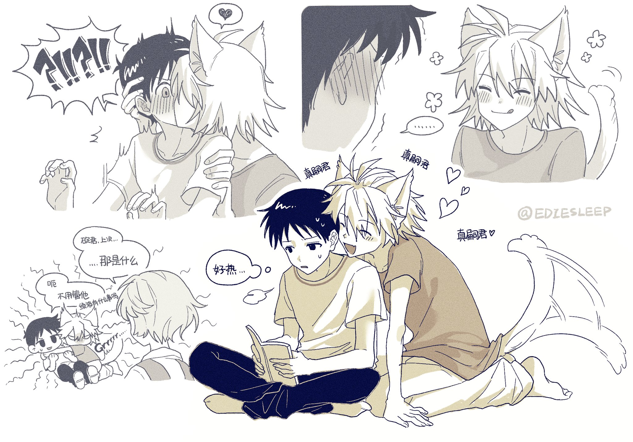 !? 1girl 2boys after_kiss angry animal_ears ayanami_rei blush book chinese_text commentary edie_zzzzz greyscale happy heart highres holding holding_book ikari_shinji indian_style jealous kiss kiss_from_behind looking_at_another male_focus monochrome multiple_boys nagisa_kaworu neon_genesis_evangelion open_book pants shirt short_hair simple_background sitting smile speech_bubble spoken_heart surprise_kiss surprised tail tail_wagging thought_bubble tongue tongue_out translation_request twitter_username untranslatable_commentary white_background yaoi