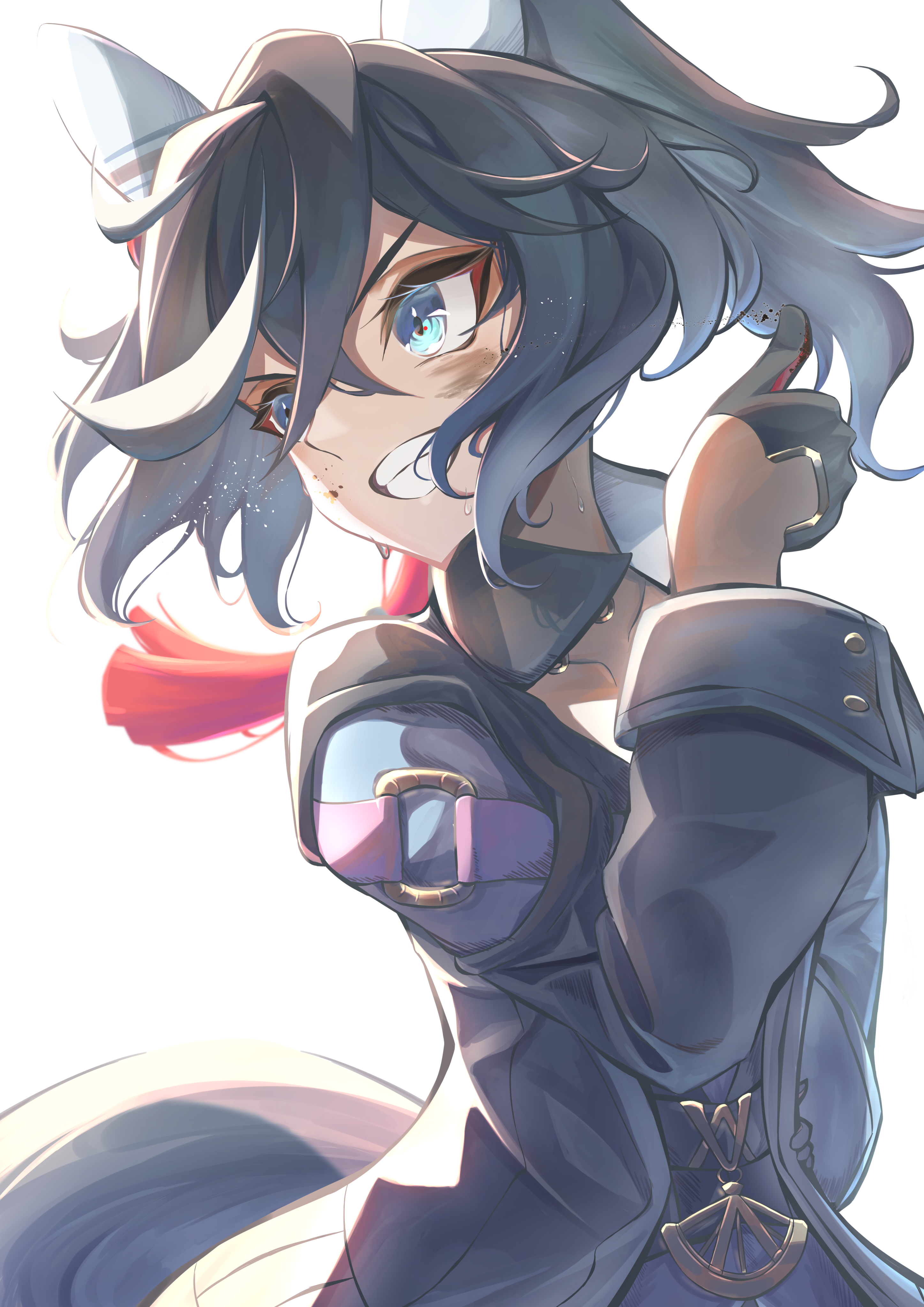 1girl absurdres animal_ears black_coat black_gloves black_hair black_jacket blue_eyes coat commentary_request dirty dirty_face ear_covers gloves hair_between_eyes hair_ornament highres horse_ears horse_girl horse_tail jacket katsuragi_ace_(dragon_rising_to_the_top)_(umamusume) katsuragi_ace_(umamusume) long_sleeves multicolored_hair open_mouth ponytail roqro_kubi smile solo streaked_hair tail tassel tassel_hair_ornament teeth umamusume white_hair