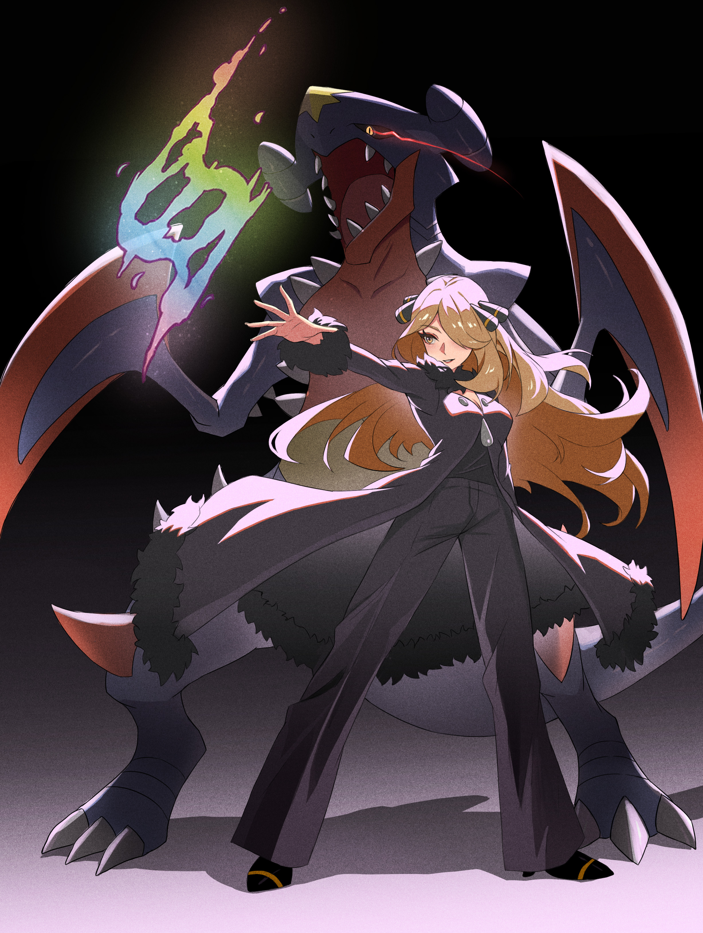 1girl absurdres black_background black_coat black_pants black_shirt blonde_hair breasts coat commentary cynthia_(pokemon) english_commentary eye_trail floating_hair full_body fur_collar garchomp gen_4_pokemon grey_eyes highres light_trail long_hair mega_evolution mega_garchomp mega_pokemon nintendo outstretched_arm pants parted_lips pokemon pokemon_(creature) pokemon_diamond/pearl/platinum shirt simple_background standing very_long_hair yyumio
