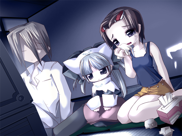 1boy 2000s_(style) 2girls blue_camisole blunt_bangs breasts brown_hair camisole capelet closed_eyes collarbone collared_shirt crying cushion dress game_cg grey_dress grey_eyes grey_hair grey_hat hair_between_eyes hair_ornament hairclip half-closed_eyes hat holding holding_tissue indoors kenki_fujioka long_hair long_sleeves magical_girl majo_no_ochakai multiple_girls night non-web_source official_art open_mouth parted_bangs ponika_(majo_no_ochakai) purple_eyes raised_inner_eyebrows shirt short_hair shorts side-by-side sitting sleeves_rolled_up small_breasts tearing_up tears television tissue tissue_box twintails used_tissue wariza watching_television wavy_mouth white_capelet white_shirt wiping yellow_shorts yuuhi_megumi_(majo_no_ochakai) zabuton