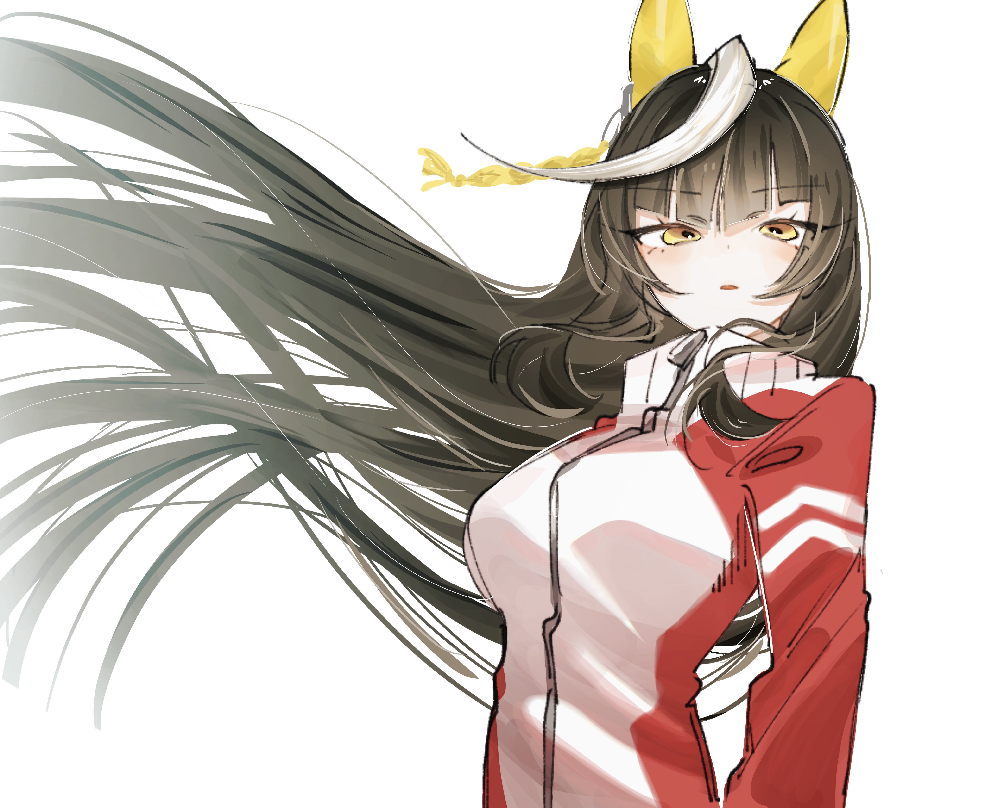 1girl absurdres ahoge animal_ears black_hair blunt_bangs breasts calstone_light_o_(umamusume) commentary ear_covers floating_hair highres horse_ears horse_girl horse_tail long_hair looking_at_viewer multicolored_hair parted_lips red_track_suit simple_background solo streaked_hair tail track_suit tree_est umamusume untranslatable_commentary upper_body white_background white_hair yellow_eyes