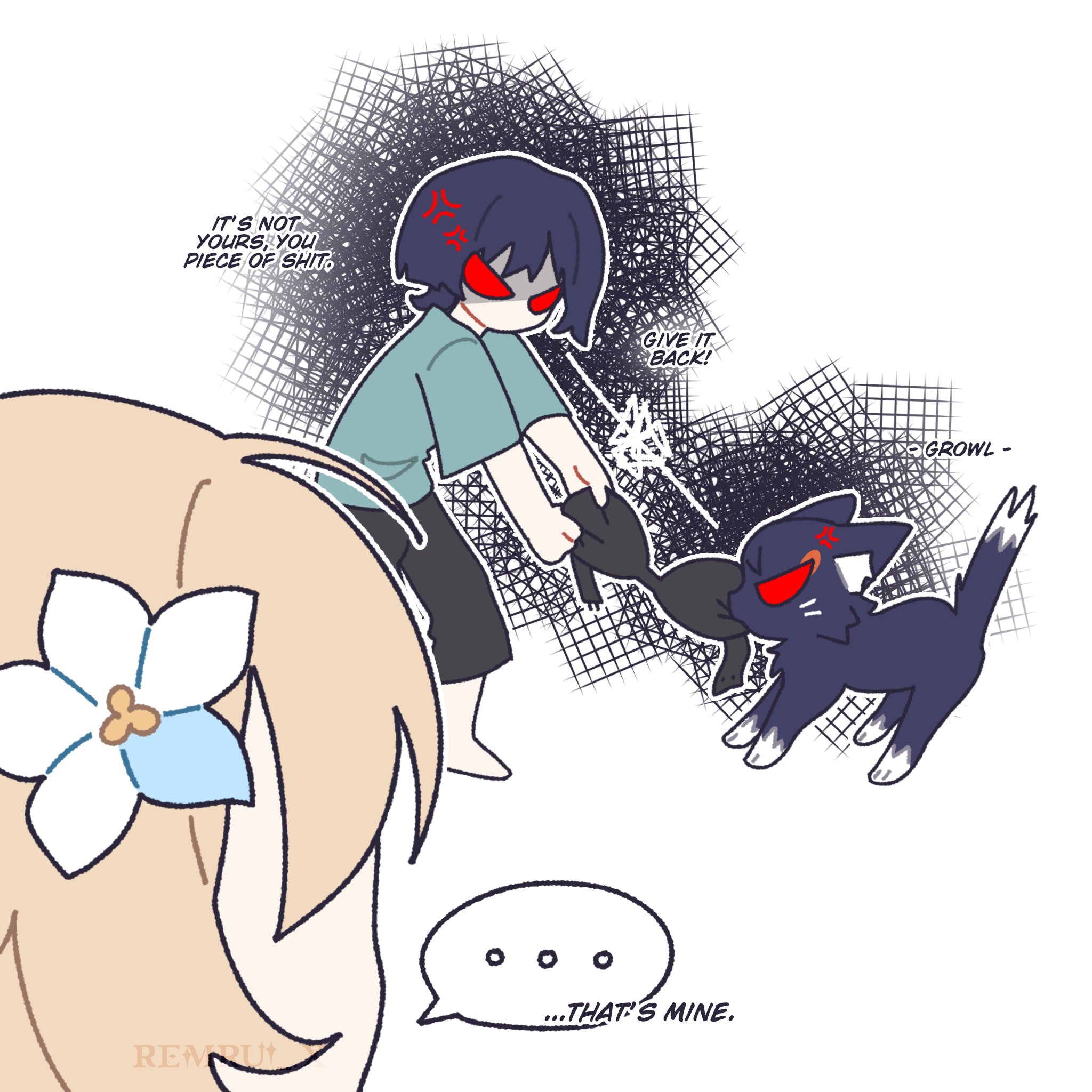 ... 1boy 1girl anger_vein animalization aqua_shirt aqua_sleeves artist_name black_bra black_cat black_hair black_pants blonde_hair blue_flower blunt_ends bra cat commentary english_commentary english_text faceless faceless_female facing_another flower genshin_impact hair_flower hair_ornament highres holding holding_bra holding_underwear holding_unworn_clothes looking_at_animal lumine_(genshin_impact) multicolored_flower no_mouth pants person_and_animalization pulling red_eyes remhotaru scaramouche_(cat)_(genshin_impact) scaramouche_(genshin_impact) shaded_face shirt short_hair short_sleeves solid_eyes speech_bubble spoken_ellipsis underwear white_background white_flower
