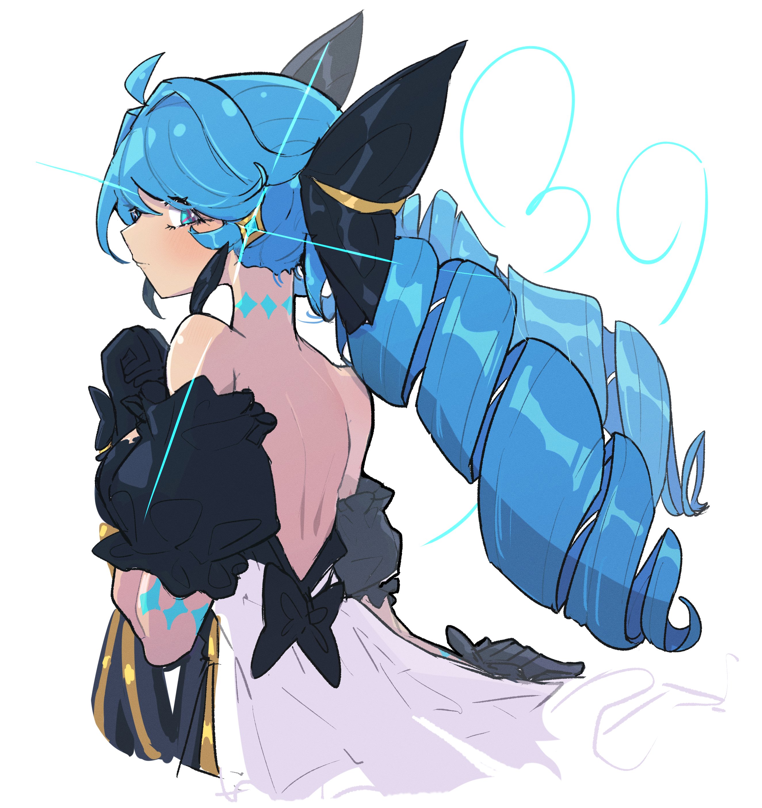 1girl absurdres ahoge bare_shoulders black_bow black_gloves blue_hair blush bow commentary dress drill_hair from_side gloves green_eyes gwen_(league_of_legends) hair_bow highres league_of_legends long_hair looking_at_viewer monakan_japan puffy_short_sleeves puffy_sleeves short_sleeves smile solo twin_drills twintails untranslatable_commentary