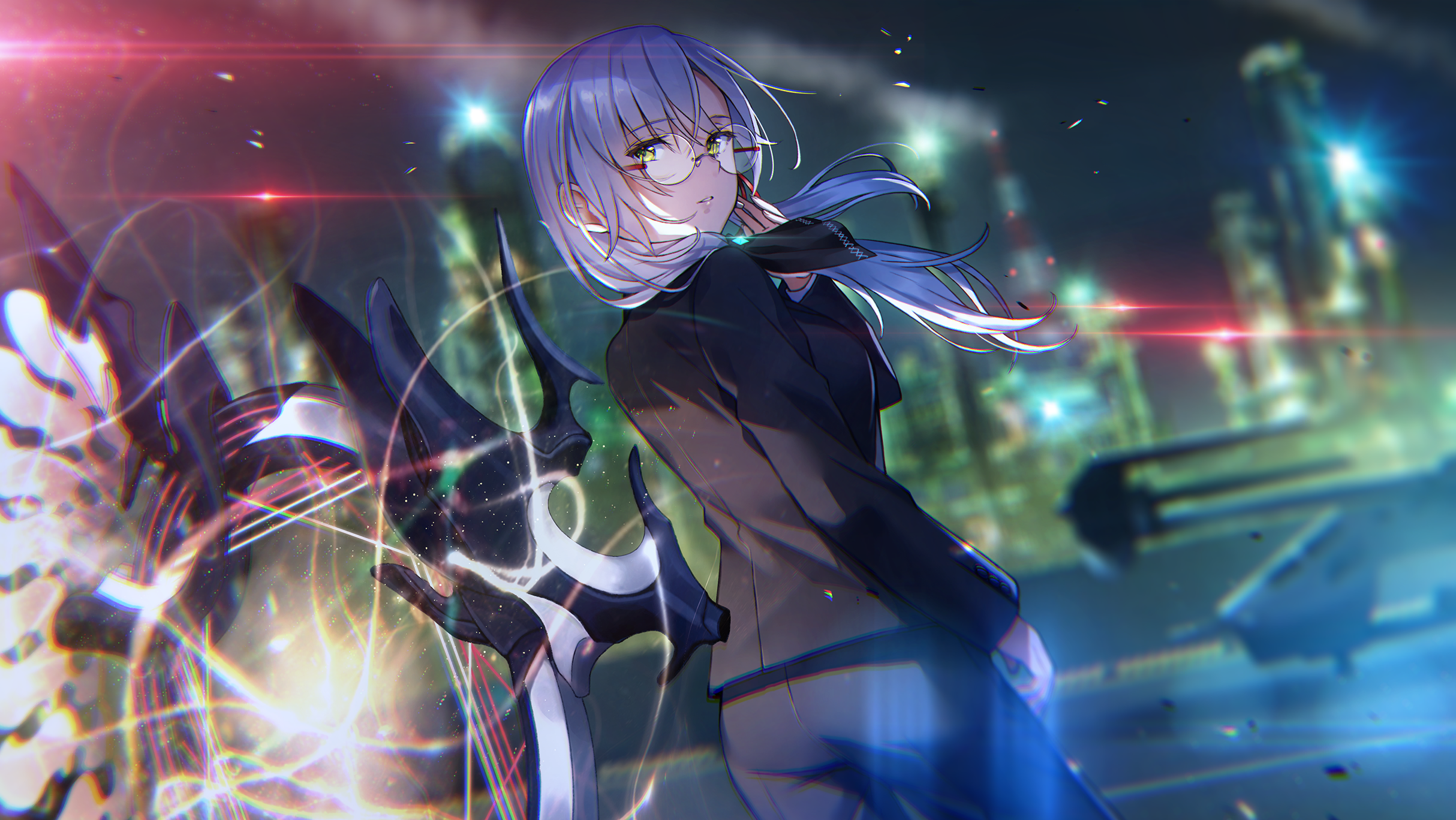 1girl arm_at_side backlighting black_jacket black_pants black_ribbon black_suit blurry blurry_background cityscape cowboy_shot eyelashes eyes_visible_through_hair floating_hair formal_clothes from_behind glasses glowing glowing_weapon green_eyes grey_hair gun hair_between_eyes hair_ribbon hand_up heaven_burns_red highres izumi_yuki izumi_yuki_(night_cruise_attendant) jacket light_particles long_hair long_sleeves low_side_ponytail night official_alternate_costume official_art outdoors pants parted_lips ribbon round_eyewear side_ponytail solo suit third-party_source weapon wind