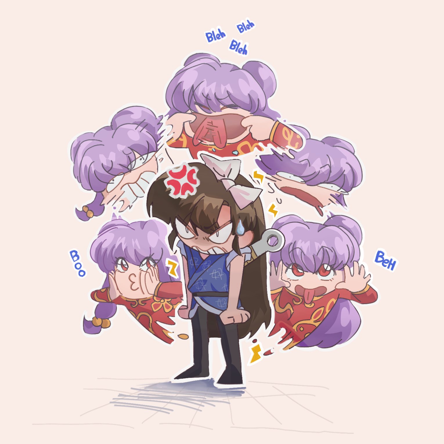 2girls anger_vein angry bell bow brown_hair chibi chinese_clothes double_bun hair_bell hair_bow hair_bun hair_ornament highres hybhu22454 kuonji_ukyou long_hair multiple_girls purple_hair ranma_1/2 red_eyes shampoo_(ranma_1/2) sidelocks simple_background sweatdrop white_bow