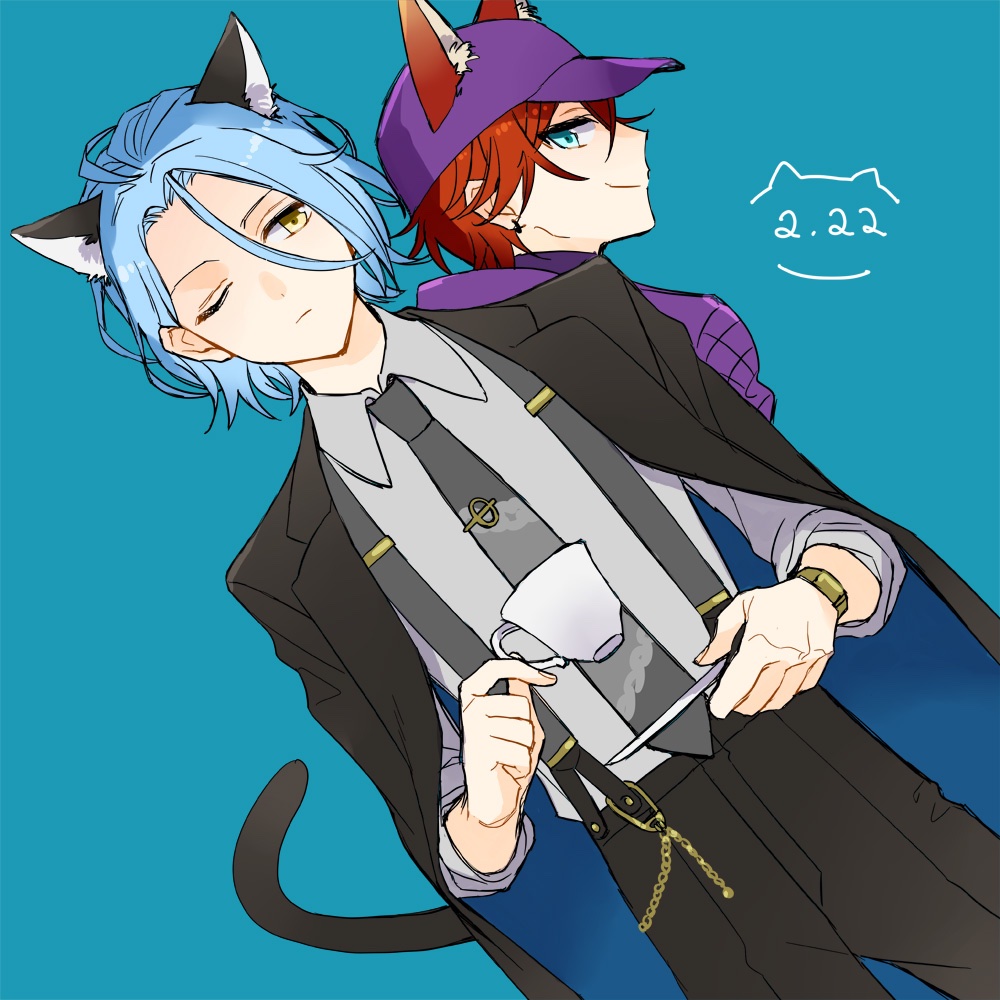 2boys amagi_rinne animal_ear_fluff animal_ears baseball_cap black_coat black_pants blue_background blue_eyes blue_hair bracelet cat_boy cat_day cat_ears cat_tail closed_eyes closed_mouth coat coat_on_shoulders commentary cowboy_shot cup dated dutch_angle earrings extra_ears grey_necktie grey_shirt hair_behind_ear hair_between_eyes hat himeru_(ensemble_stars!) holding holding_cup holding_saucer jewelry kemonomimi_mode long_hair_between_eyes looking_at_another looking_back looking_to_the_side male_focus multiple_boys necktie ninami73 pants purple_hat purple_shirt red_hair saucer shirt simple_background sleeves_rolled_up smile suspenders tail tie_clip wallet_chain yellow_eyes