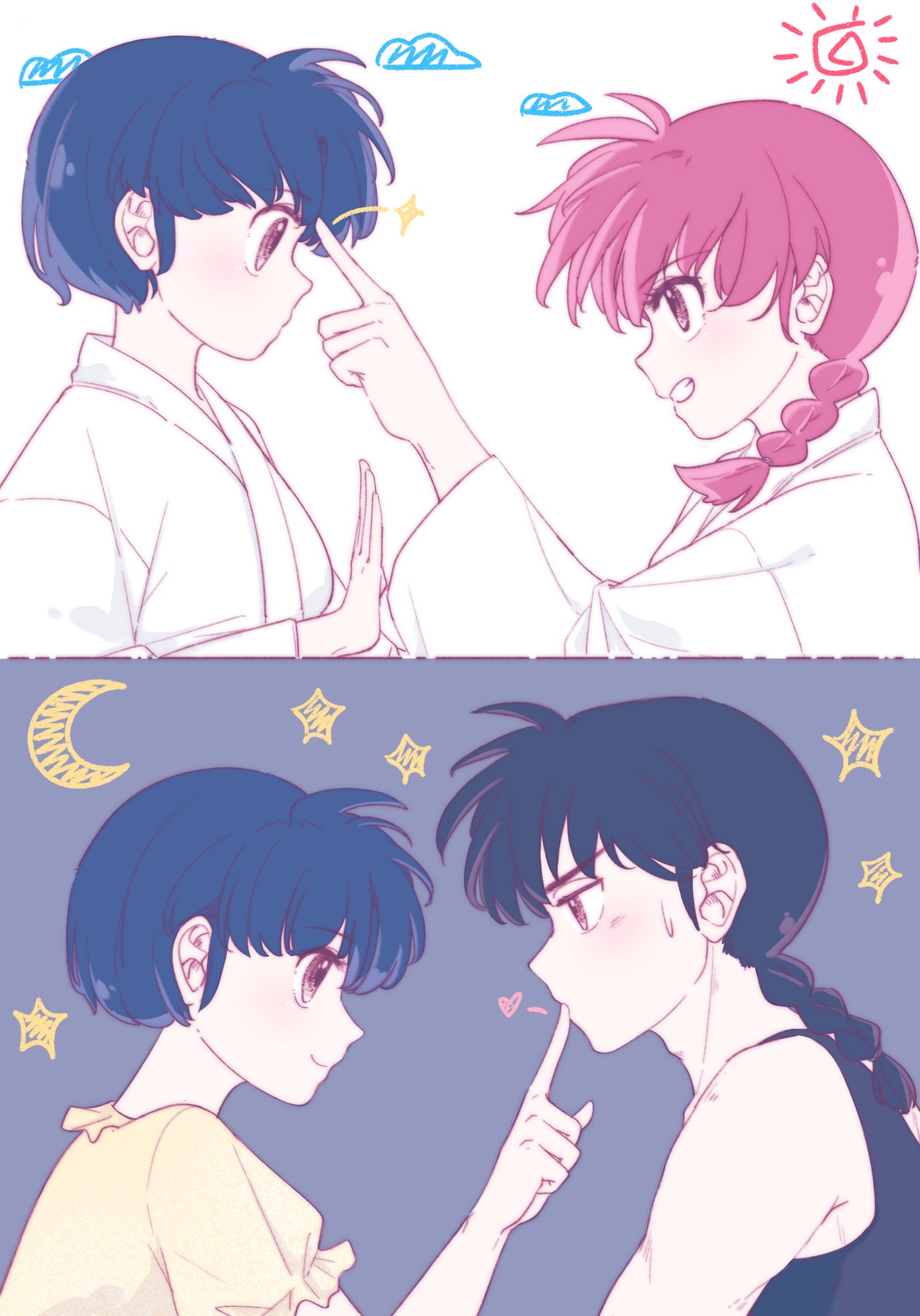 1boy 2girls akarinaakari black_hair braid closed_mouth commentary from_side grin highres multiple_girls poking ranma-chan ranma_1/2 saotome_ranma short_hair single_braid smile tendou_akane untranslatable_commentary