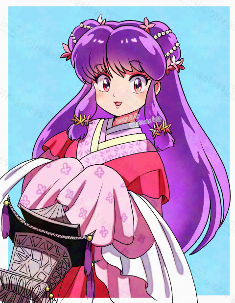 01angelegg 1girl artist_name blue_background blush commentary_request dated hair_ornament holding holding_lantern lantern long_hair looking_at_viewer purple_hair ranma_1/2 red_eyes shampoo_(ranma_1/2) sidelocks sleeves_past_fingers sleeves_past_wrists