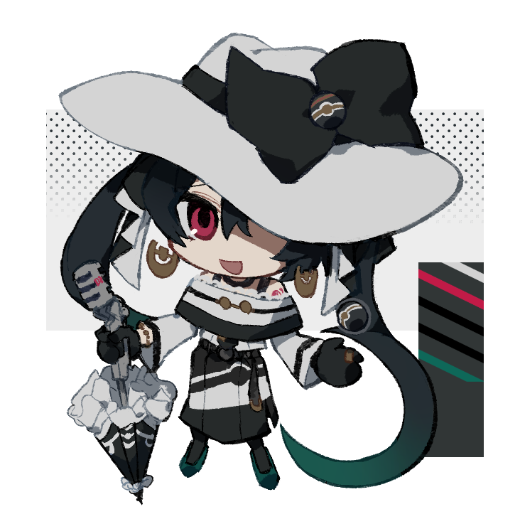 1girl asymmetrical_hair belt black_belt black_bow black_gloves black_hair black_umbrella bow chibi chibi_only commentary dark_miku_(project_voltage) dress earrings flats frilled_umbrella frills full_body gloves gold_earrings green_shoes hat hat_bow hatsune_miku holding holding_microphone holding_poke_ball holding_umbrella jewelry large_hat long_belt long_sleeves looking_at_viewer luxury_ball melvi0 microphone nintendo off-shoulder_dress off_shoulder one_eye_covered open_mouth parasol picture_hat pink_eyes poke_ball poke_ball_print pokemon project_voltage ring shoes smile solo striped_clothes striped_dress symbol-shaped_hair twintails two-tone_dress umbrella uneven_twintails vocaloid white_dress white_hat