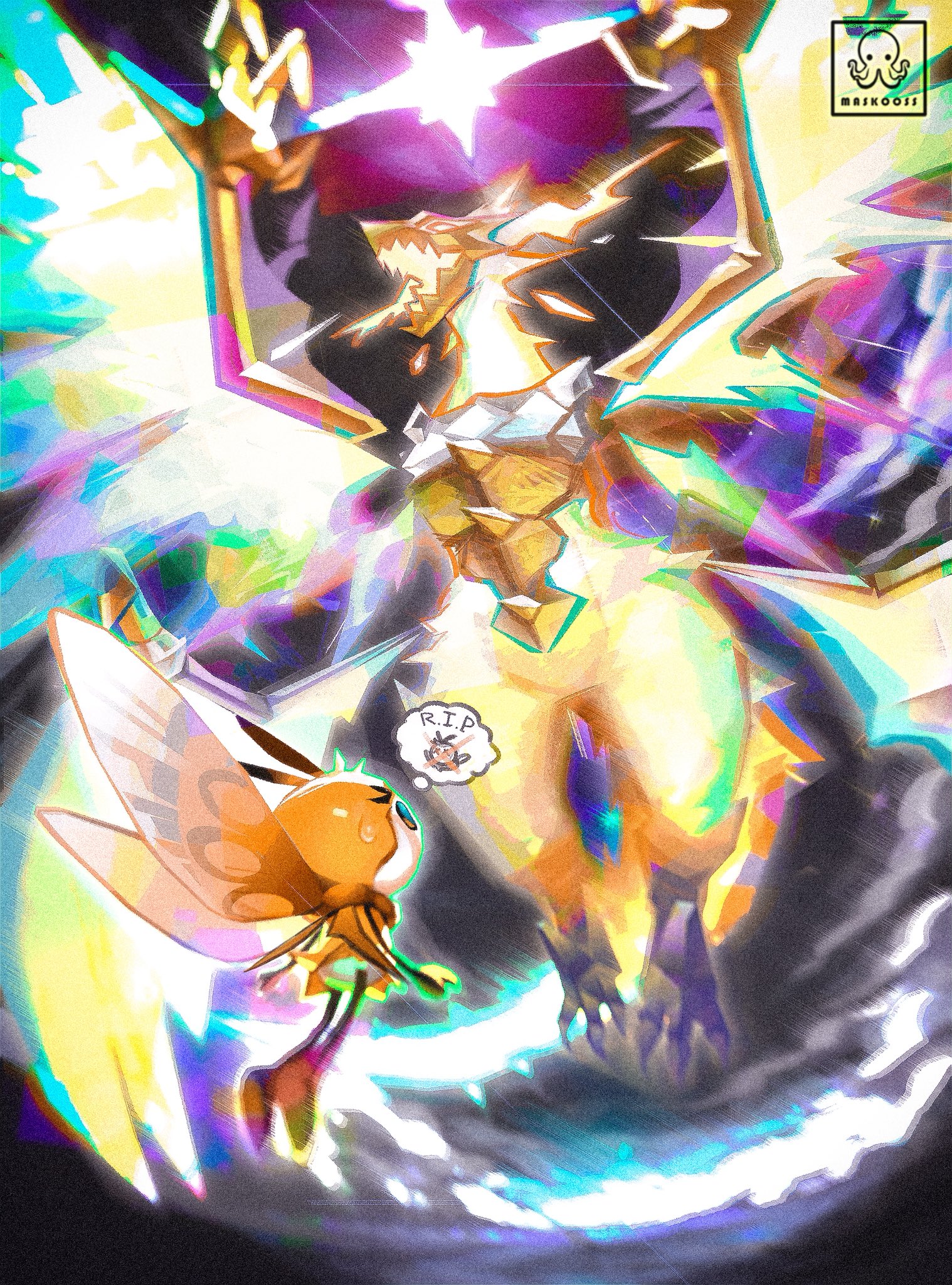 antennae brown_scarf clawed_wings claws cloud dragon flying from_behind full_body gen_7_pokemon glowing highres insect_wings legendary_pokemon maskoo185826 multiple_wings necrozma necrozma_(ultra) nintendo open_mouth pokemon pokemon_(creature) pokemon_focus rainbow_outline ribombee scarf sharp_teeth speech_bubble sweatdrop teeth thought_bubble wings