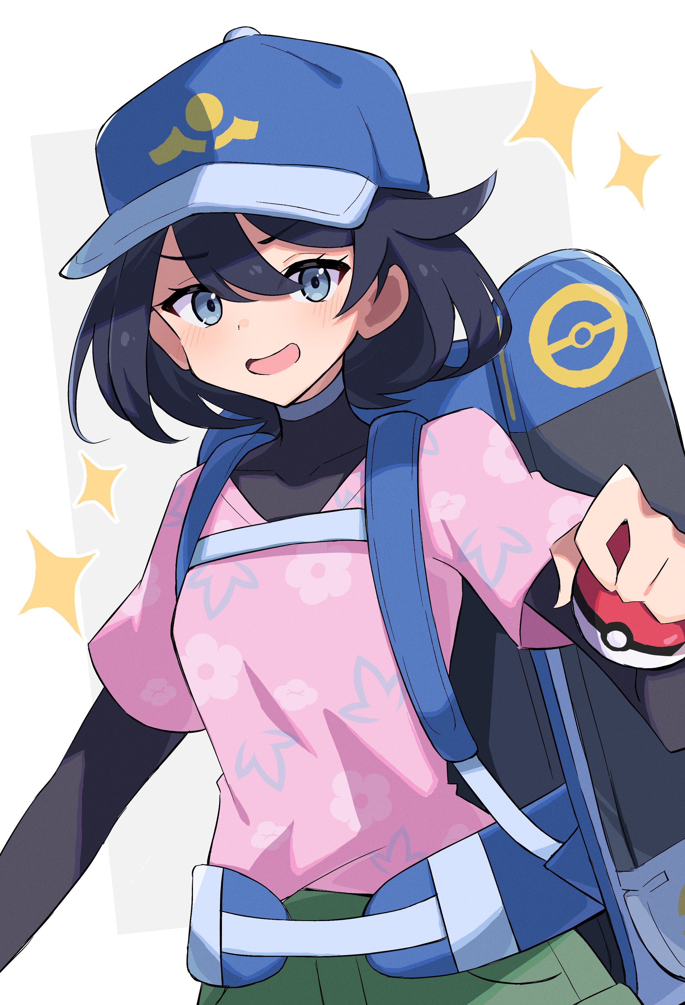 1girl absurdres backpack bag black_bodysuit black_hair blue_eyes blue_hat blush bodysuit bodysuit_under_clothes commentary_request female_protagonist_(pokemon_ww) floral_print_shirt green_shorts hat highres holding holding_poke_ball layered_sleeves long_sleeves looking_at_viewer nintendo open_mouth pink_shirt piyo_to_game poke_ball poke_ball_(basic) pokemon pokemon_winds_and_waves shirt short_hair short_over_long_sleeves short_sleeves shorts smile