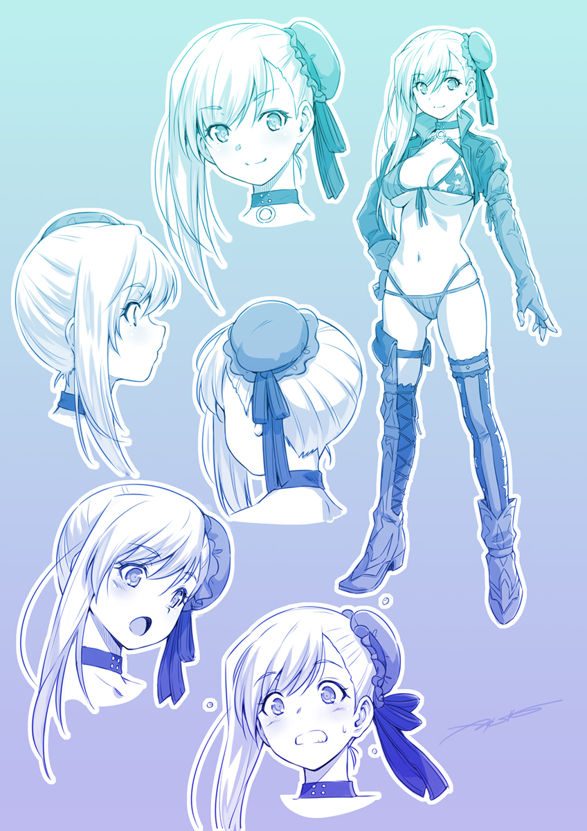 1girl amamiya_elena american_flag american_flag_bikini american_flag_print artist_name asymmetrical_hair bikini blue_theme boots breasts bun_cover choker closed_mouth commentary fate/grand_order fate_(series) flag_print flag_print_bikini front-tie_bikini_top front-tie_top frown gradient_theme grimace hair_bun halterneck hand_on_own_hip highres kazuma_muramasa large_breasts long_hair looking_at_viewer miyamoto_musashi_(fate) miyamoto_musashi_(fate/grand_order) miyamoto_musashi_(swimsuit_berserker)_(fate) miyamoto_musashi_(swimsuit_berserker)_(second_ascension)_(fate) monochrome multi-strapped_bikini_bottom multiple_expressions navel open_mouth print_bikini shrug_(clothing) signature single_hair_bun smile sweatdrop swimsuit thighhighs