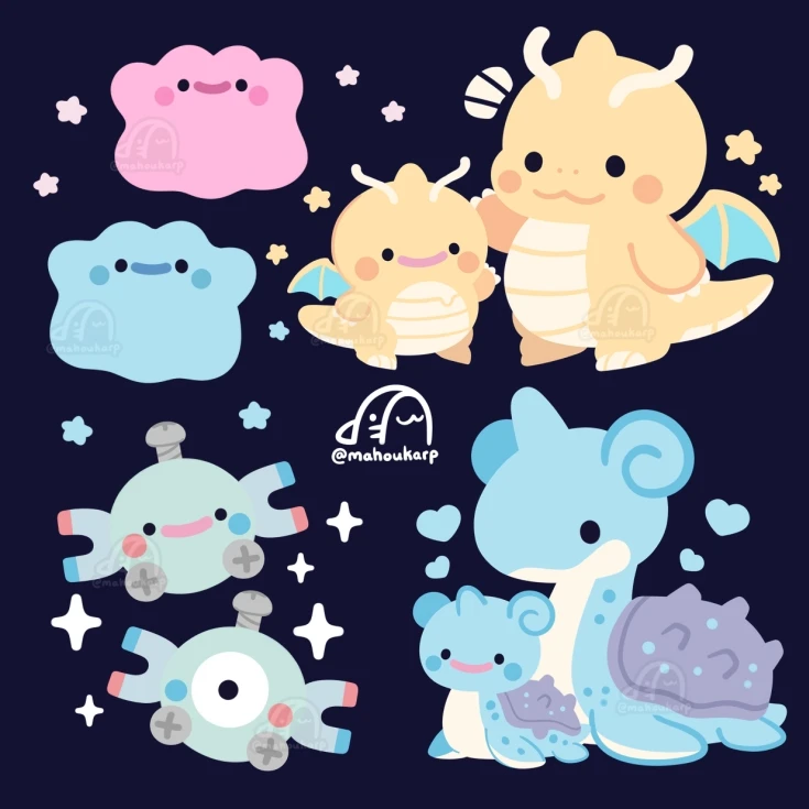 alternate_color claws closed_mouth commentary ditto dragon dragonite gen_1_pokemon horns lapras magnemite magnet mahoukarp nintendo no_humans open_mouth pokemon pokemon_(creature) pokemon_focus pokemon_pokopia screw shell shiny_and_normal shiny_pokemon single_horn smile solid_circle_eyes star_(symbol) transformed_ditto wings