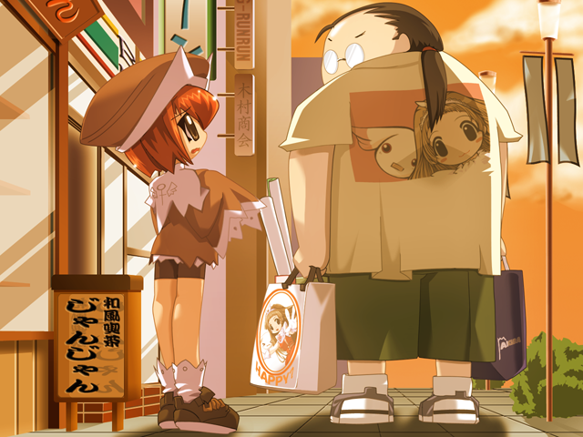 1boy 1girl 2000s_(style) bag bike_shorts billboard black_hair brown_eyes brown_shirt brown_shoes capelet cloud evening fat fat_man from_side full_body game_cg glasses hands_up hat holding holding_bag kenki_fujioka lamppost long_hair long_sleeves low_ponytail majo_no_ochakai nee_(majo_no_ochakai) non-web_source official_art opaque_glasses open_mouth orange_hair otaku paper_bag ponytail raised_inner_eyebrows round_eyewear shirt shoes short_hair sidelocks size_difference sky sleeves_past_fingers sleeves_past_wrists socks standing t-shirt town v-shaped_eyebrows variant_set wavy_mouth white_capelet white_socks wide_sleeves