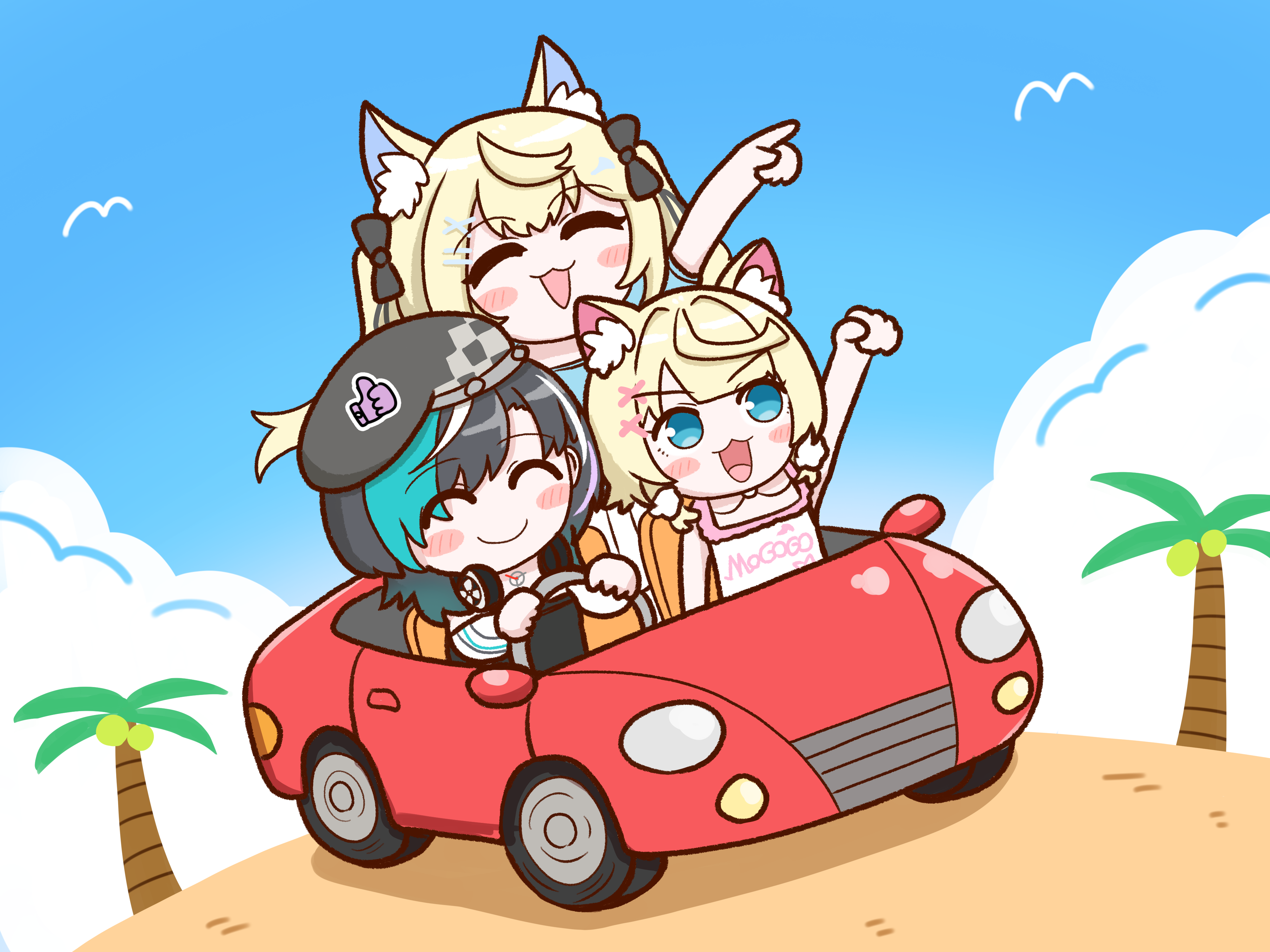3girls :3 :d absurdres aqua_hair beret bird black_hair black_hat blonde_hair blue_eyes car chibi closed_eyes closed_mouth commentary_request driving fuwawa_abyssgard fuwawa_abyssgard_(casual) hair_ornament hat highres hololive hololive_dev_is hololive_english mococo_abyssgard mococo_abyssgard_(casual) motor_vehicle multicolored_hair multiple_girls official_alternate_costume open_mouth outdoors palm_tree rindo_chihaya rindo_chihaya_(1st_costume) siblings sisters smile streaked_hair tree tsuyoshi_(normal811) twins virtual_youtuber white_streaks x_hair_ornament
