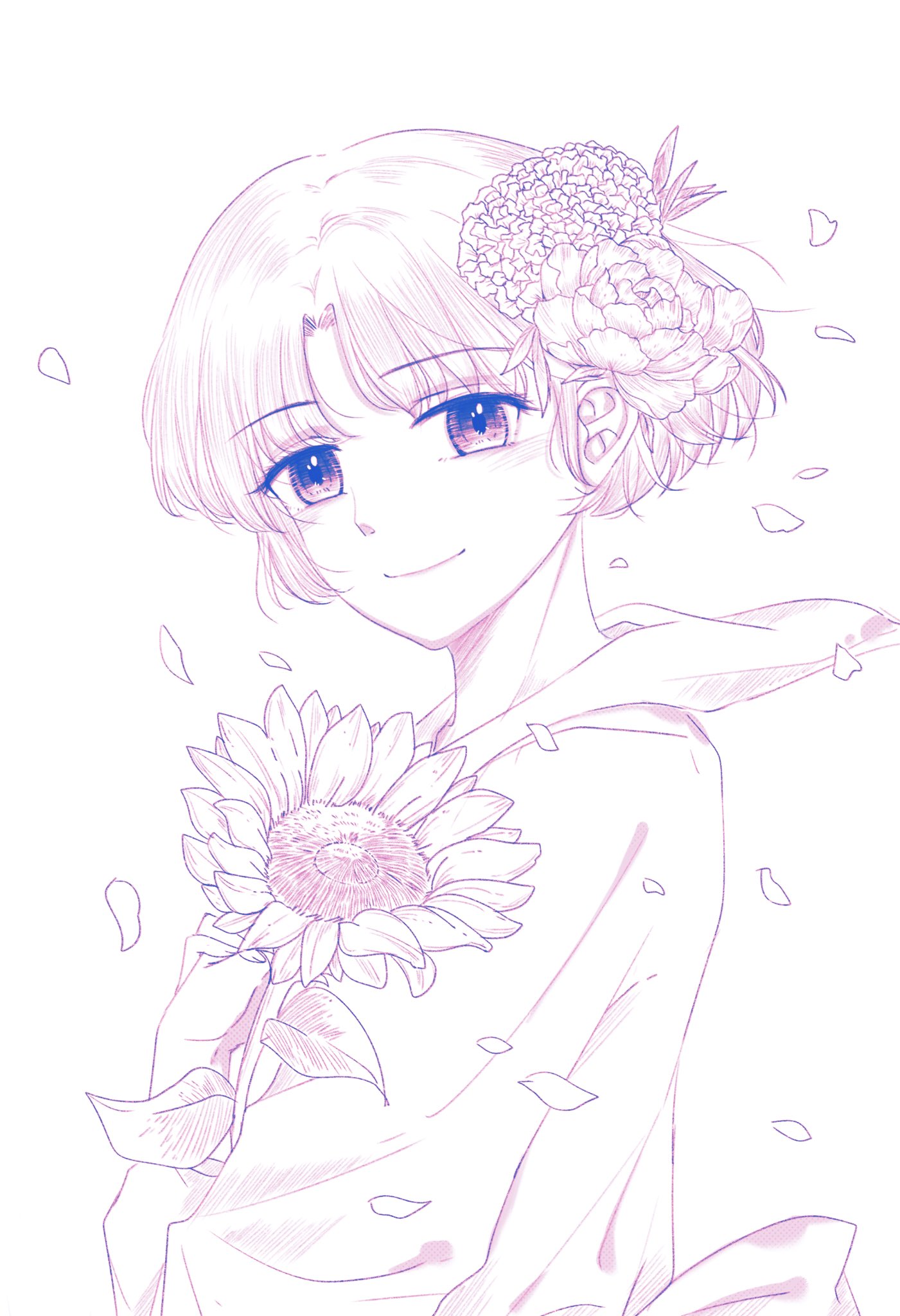 1girl akarinaakari commentary falling_petals flower flower_request hair_flower hair_ornament highres holding holding_flower looking_at_viewer monochrome petals ranma_1/2 short_hair smile solo sunflower tendou_akane untranslatable_commentary upper_body