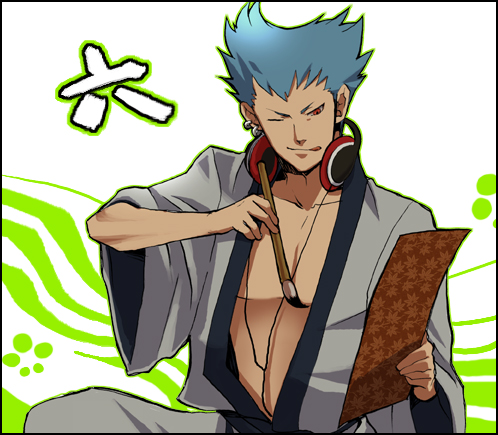 1boy bemani blue_hair calligraphy_brush collarbone commentary_request grey_kimono headphones headphones_around_neck homa_kura japanese_clothes kimono lowres male_focus one_eye_closed paintbrush pop'n_music red_eyes roku_(pop'n_music) sitting solo writing