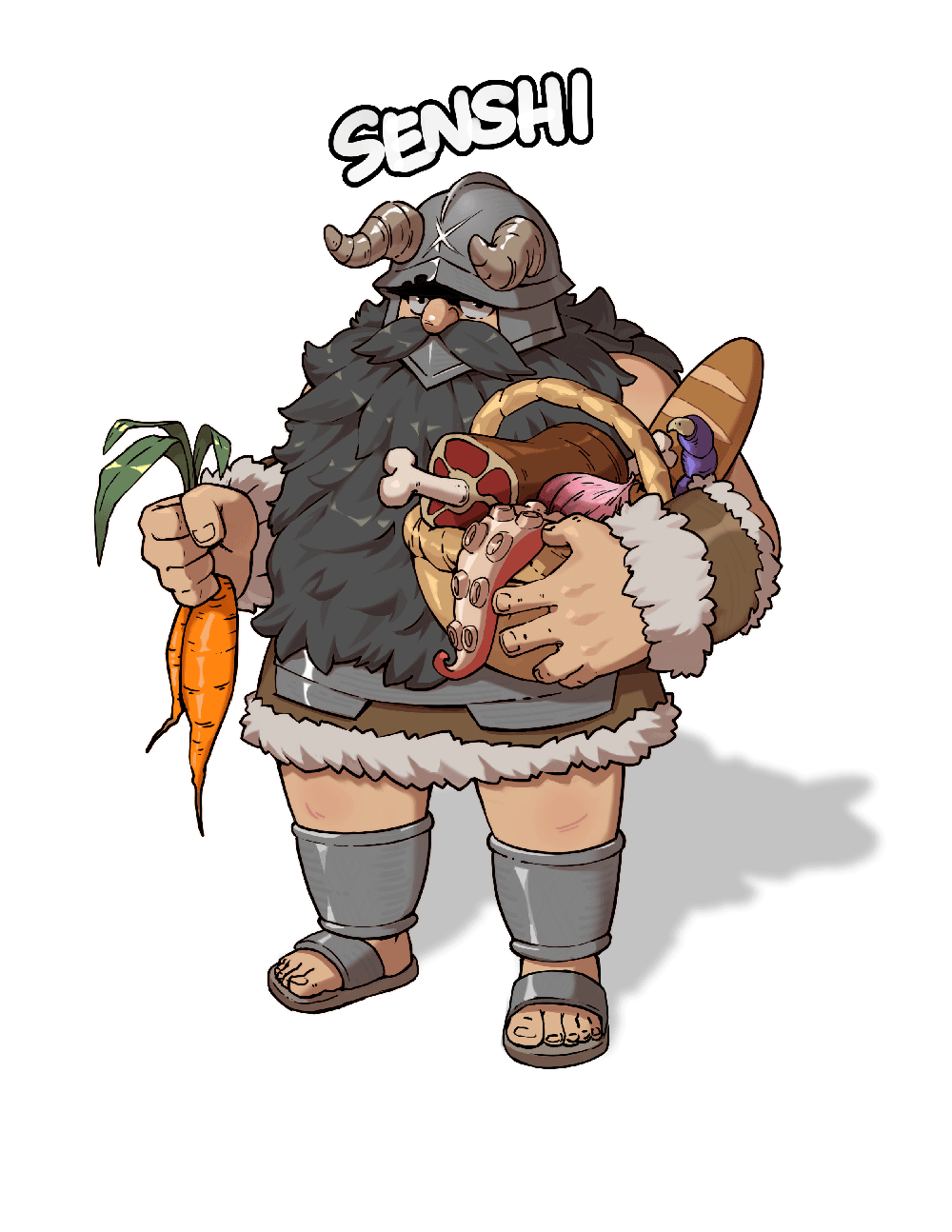 1boy beard bread carrot character_name commentary dungeon_meshi dwarf english_commentary facial_hair food full_beard full_body helmet highres holding holding_food holding_vegetable jahstun long_beard male_focus mustache sandals senshi_(dungeon_meshi) vegetable very_long_beard white_background
