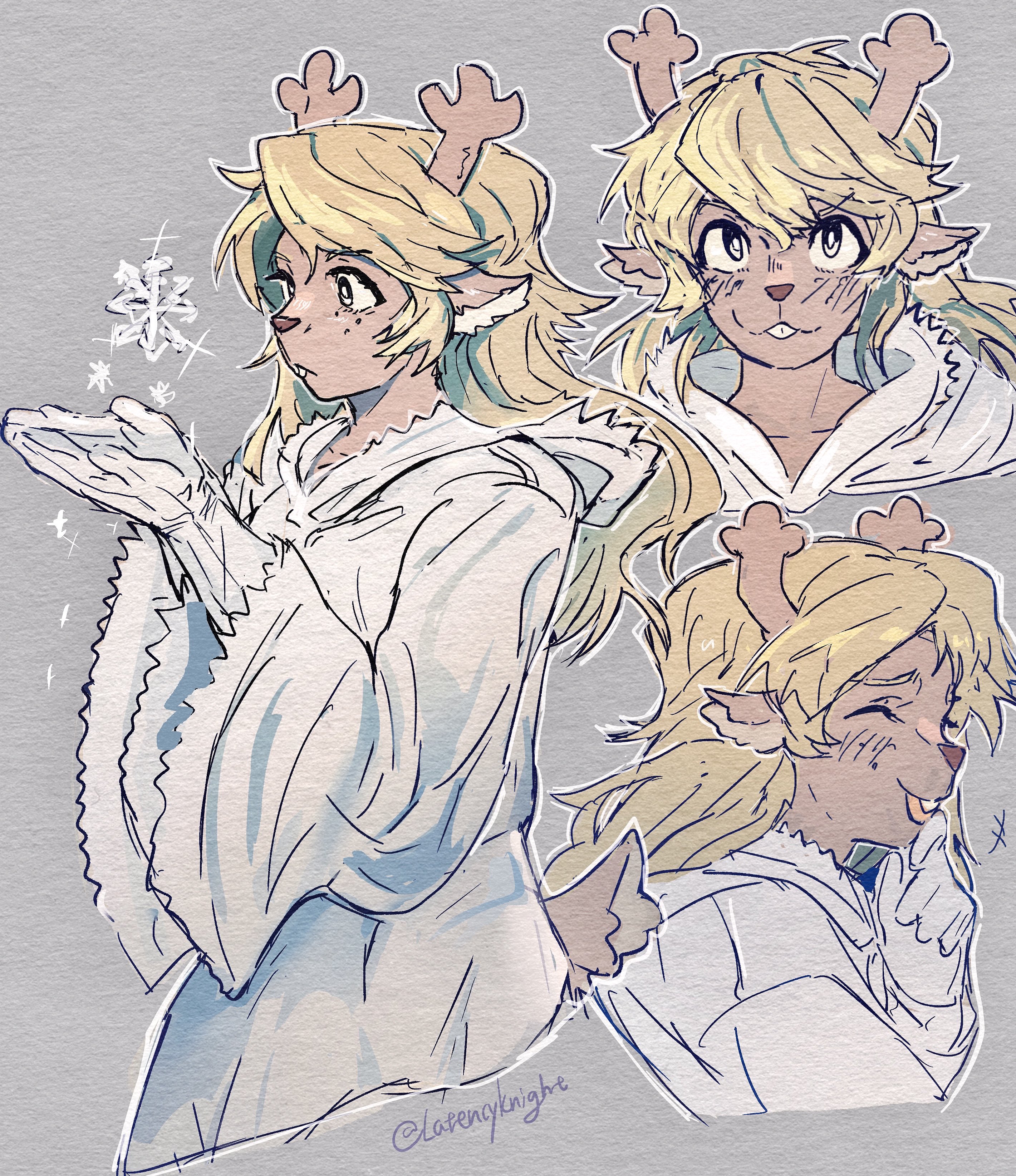 +++ 1girl absurdres animal_ears antlers artist_name blonde_hair bright_pupils buck_teeth cloak closed_mouth commentary deer_ears deer_tail deltarune english_commentary freckles furry furry_female gloves grey_background highres hood hood_down horns latencyknight long_hair looking_at_viewer noelle_holiday noelle_holiday_(dark_world) open_mouth reindeer_antlers reindeer_girl simple_background smile solo tail teeth twitter_username utdr_(toby_fox) white_cloak white_gloves white_pupils