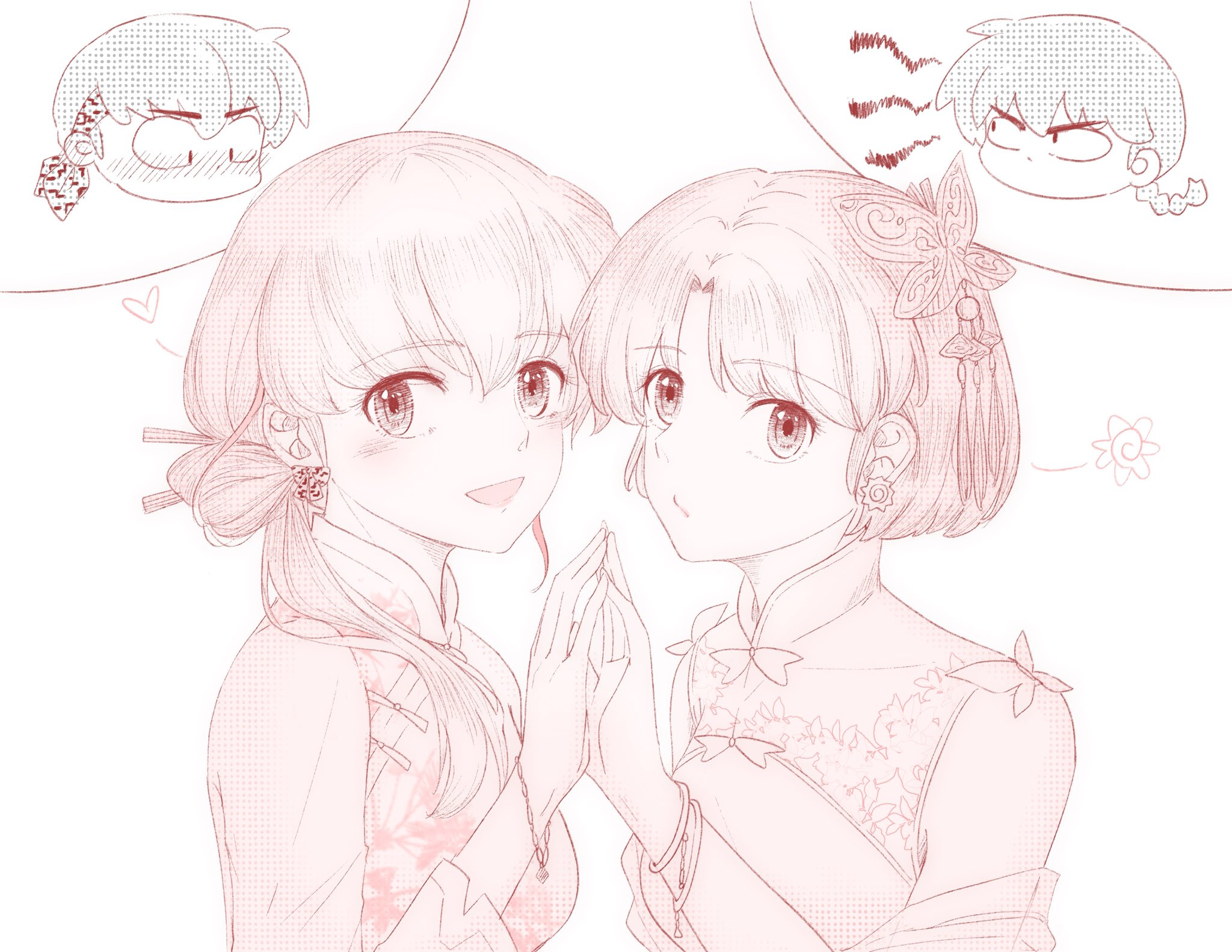 2boys 2girls :d akarinaakari blush braid butterfly_hair_ornament character_request chibi chinese_clothes closed_mouth commentary_request hair_ornament hand_up heart hibiki_ryouga highres monochrome multiple_boys multiple_girls open_mouth ranma_1/2 saotome_ranma short_hair single_braid smile tendou_akane upper_body