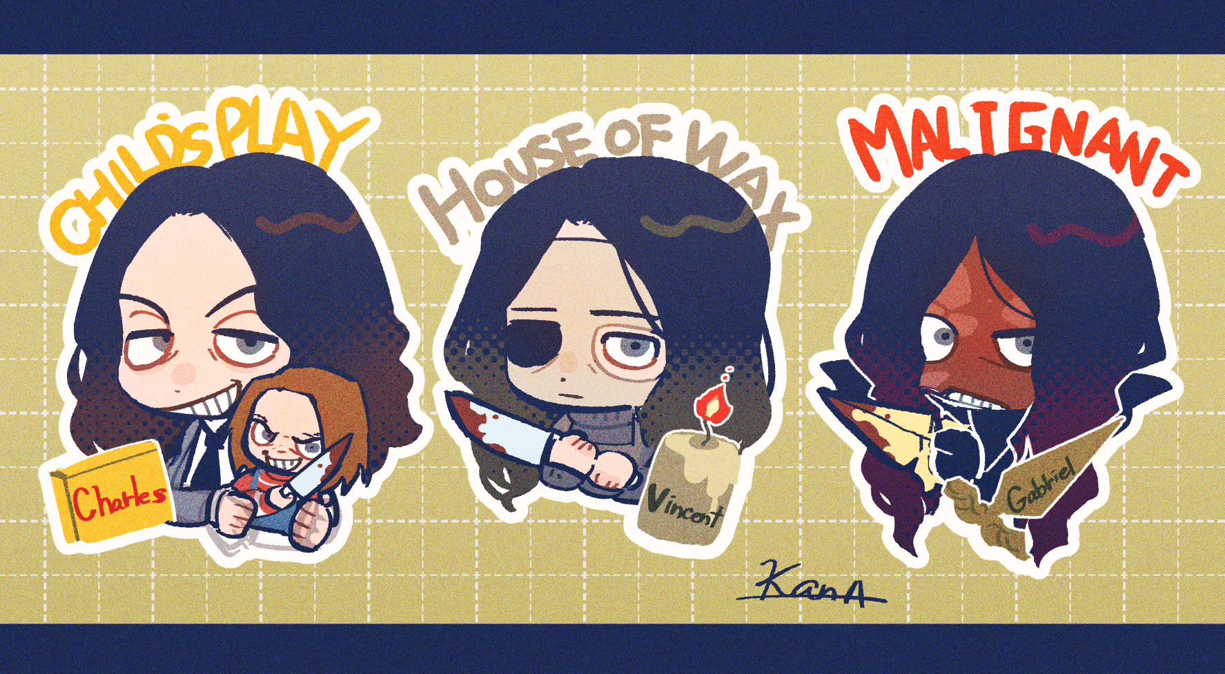 3boys black_necktie blue_eyes candle character_name charles_lee_ray chibi chibi_only child's_play chucky commentary_request copyright_name gabriel_may grey_eyes grey_sweater grid_teeth grimace highres holding holding_knife house_of_wax_(2005_movie) kana_(kanaice) knife malignant_(movie) mask multiple_boys necktie sweater trait_connection vincent_sinclair