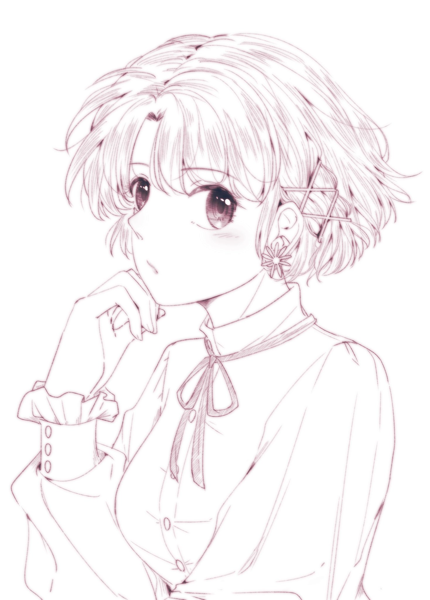 1girl akarinaakari buttons closed_mouth commentary earrings flower_earrings hair_ornament hairclip hand_up highres jewelry monochrome ranma_1/2 shirt short_hair solo tagme tendou_akane untranslatable_commentary upper_body