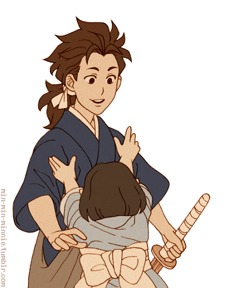 1boy 1girl aged_down alternate_costume alternate_hairstyle brown_eyes brown_hair commentary english_commentary female_corrin_(fire_emblem) fire_emblem fire_emblem_fates hug japanese_clothes jasmine_(min-min-minnie) long_hair nintendo ryoma_(fire_emblem)