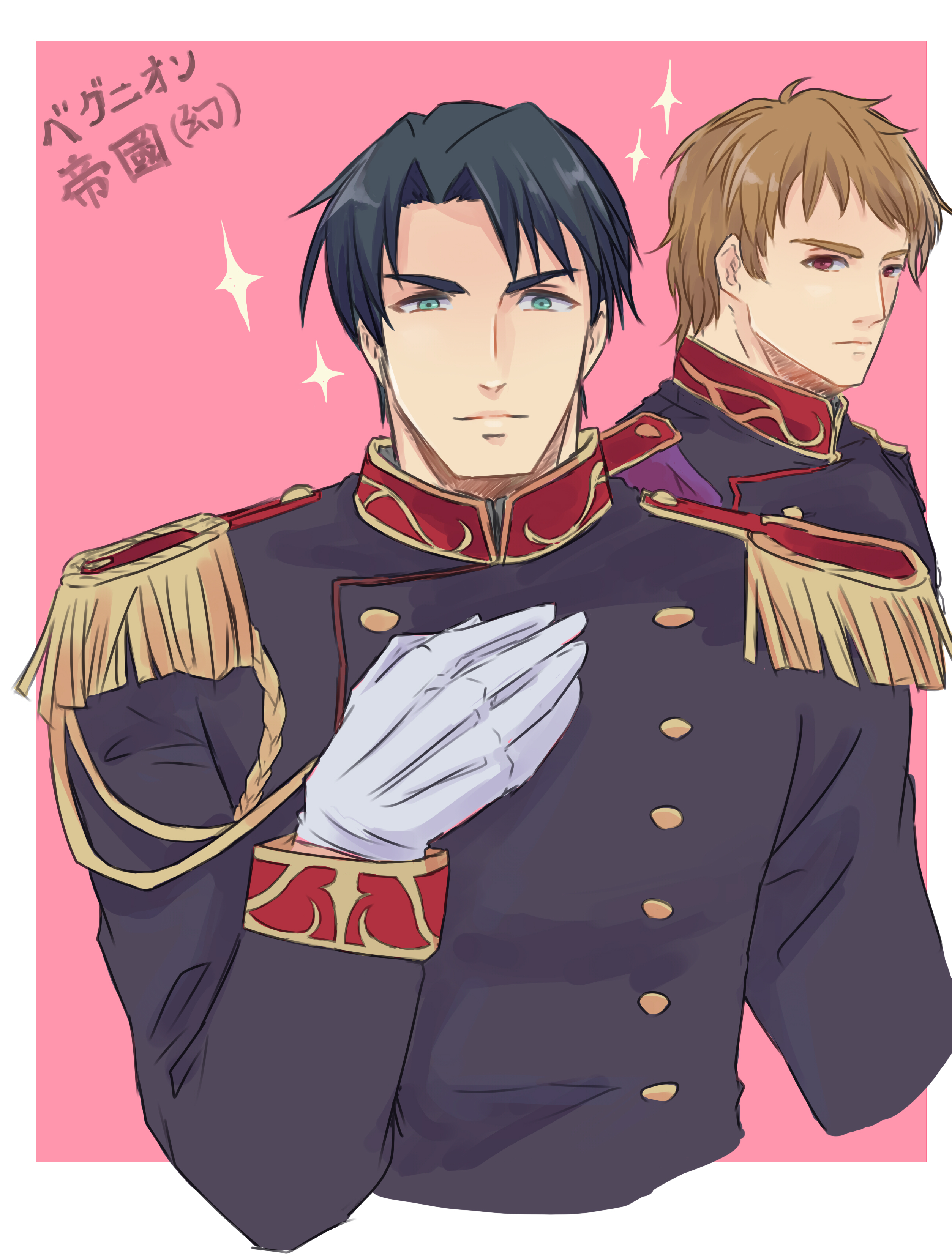 2boys absurdres alternate_costume black_hair brown_hair closed_mouth commentary_request cropped_arm cropped_torso epaulettes fire_emblem fire_emblem:_radiant_dawn gloves green_eyes hand_on_own_chest highres kamabokozin levail_(fire_emblem) looking_at_viewer male_focus multiple_boys nintendo outside_border red_eyes short_hair translation_request white_gloves zelgius_(fire_emblem)