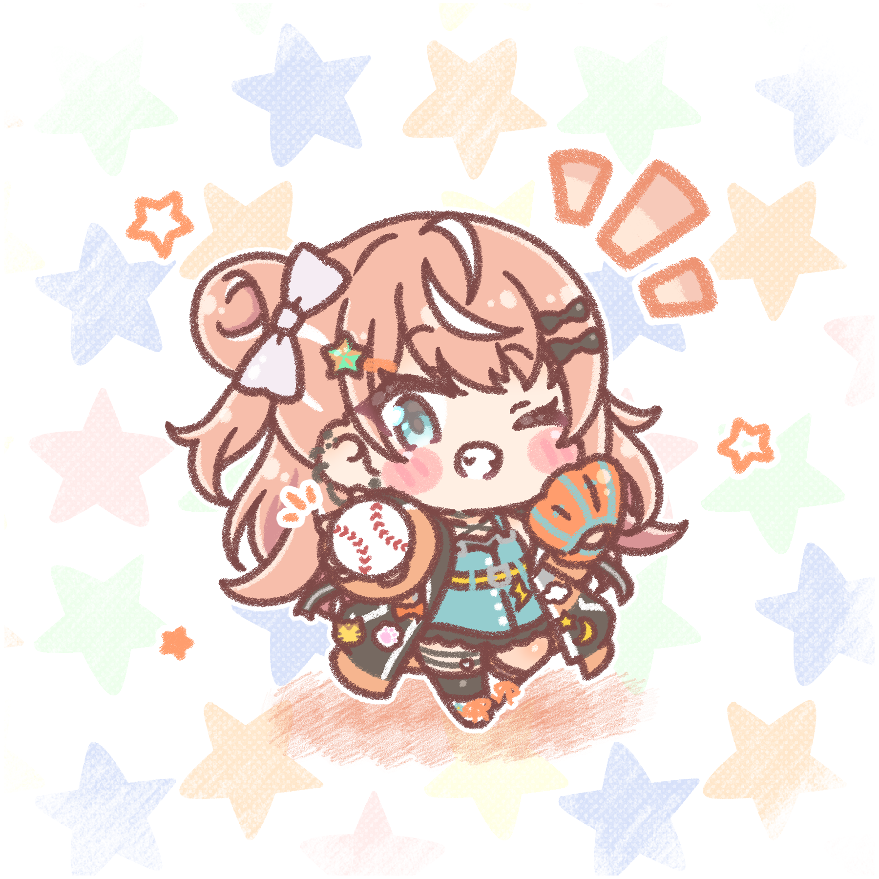 1girl asymmetrical_legwear ball baseball_(object) baseball_glove black_bow black_thighhighs blue_dress blue_eyes blush_stickers boots bow brown_hair brown_jacket brown_socks chibi colored_shadow commentary_request dress ear_piercing grey_bow grin hair_bow hair_bun hair_ornament hairclip highres holding holding_ball igarashi_rika igarashi_rika_(1st_costume) jacket long_hair long_sleeves mitarashi_neko multicolored_hair nijisanji notice_lines one_eye_closed one_side_up open_clothes open_jacket piercing puffy_long_sleeves puffy_sleeves shadow single_side_bun single_sock single_thighhigh smile socks solo star_(symbol) star_hair_ornament streaked_hair thighhighs very_long_hair virtual_youtuber white_background white_boots white_hair