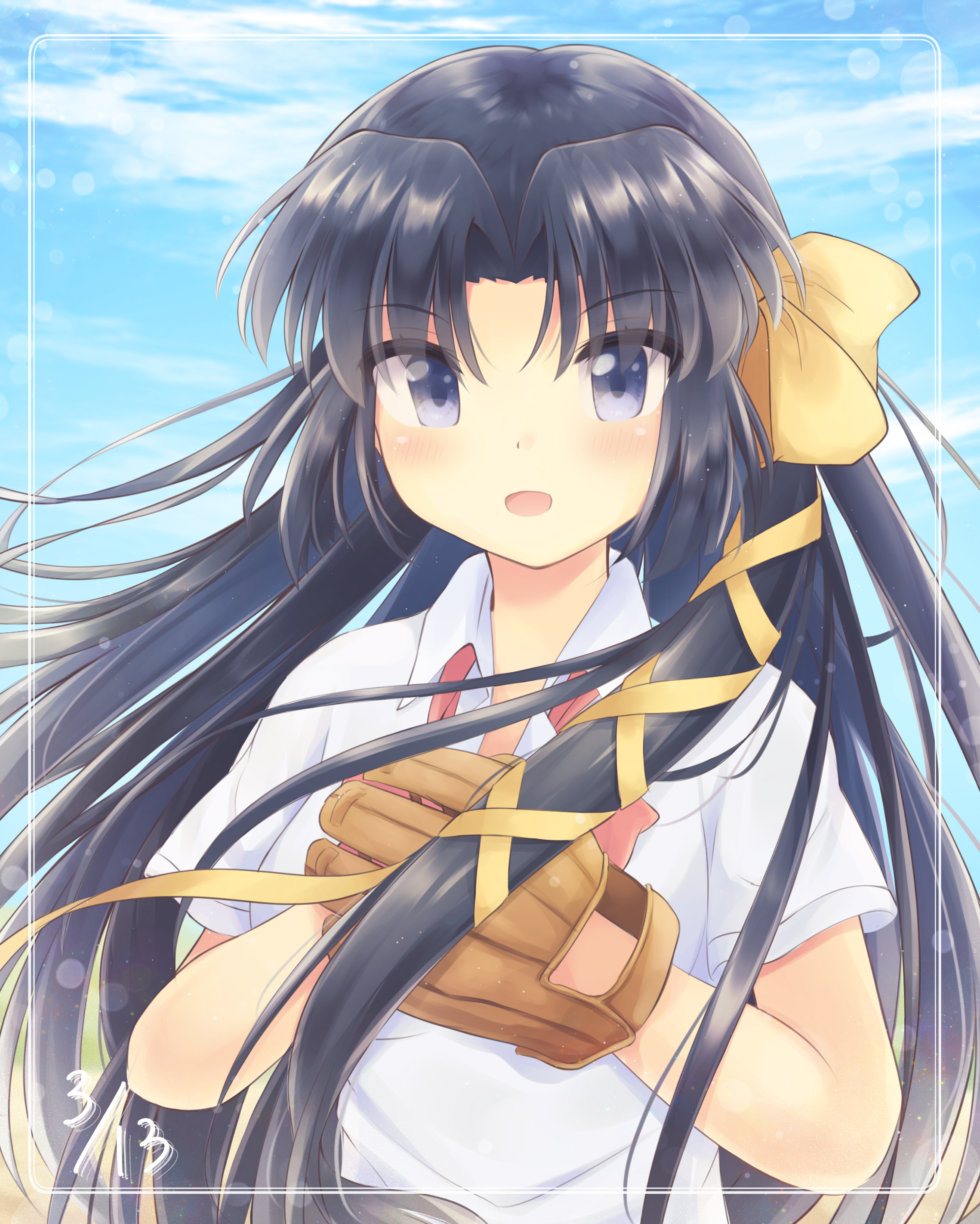 1girl :d absurdres baseball_glove black_hair blue_eyes blush bow bowtie clip_studio_paint_(medium) collared_shirt commentary_request dated dated_commentary day dress_shirt eyes_visible_through_hair floating_hair hair_bow hair_ribbon hands_up highres kurugaya_yuiko little_busters! little_busters!_school_uniform long_hair long_ribbon looking_at_viewer mitsuna open_mouth outdoors own_hands_together parted_bangs pink_bow pink_bowtie ribbon school_uniform shirt short_sleeves smile solo straight_hair tress_ribbon upper_body very_long_hair white_shirt yellow_bow yellow_ribbon