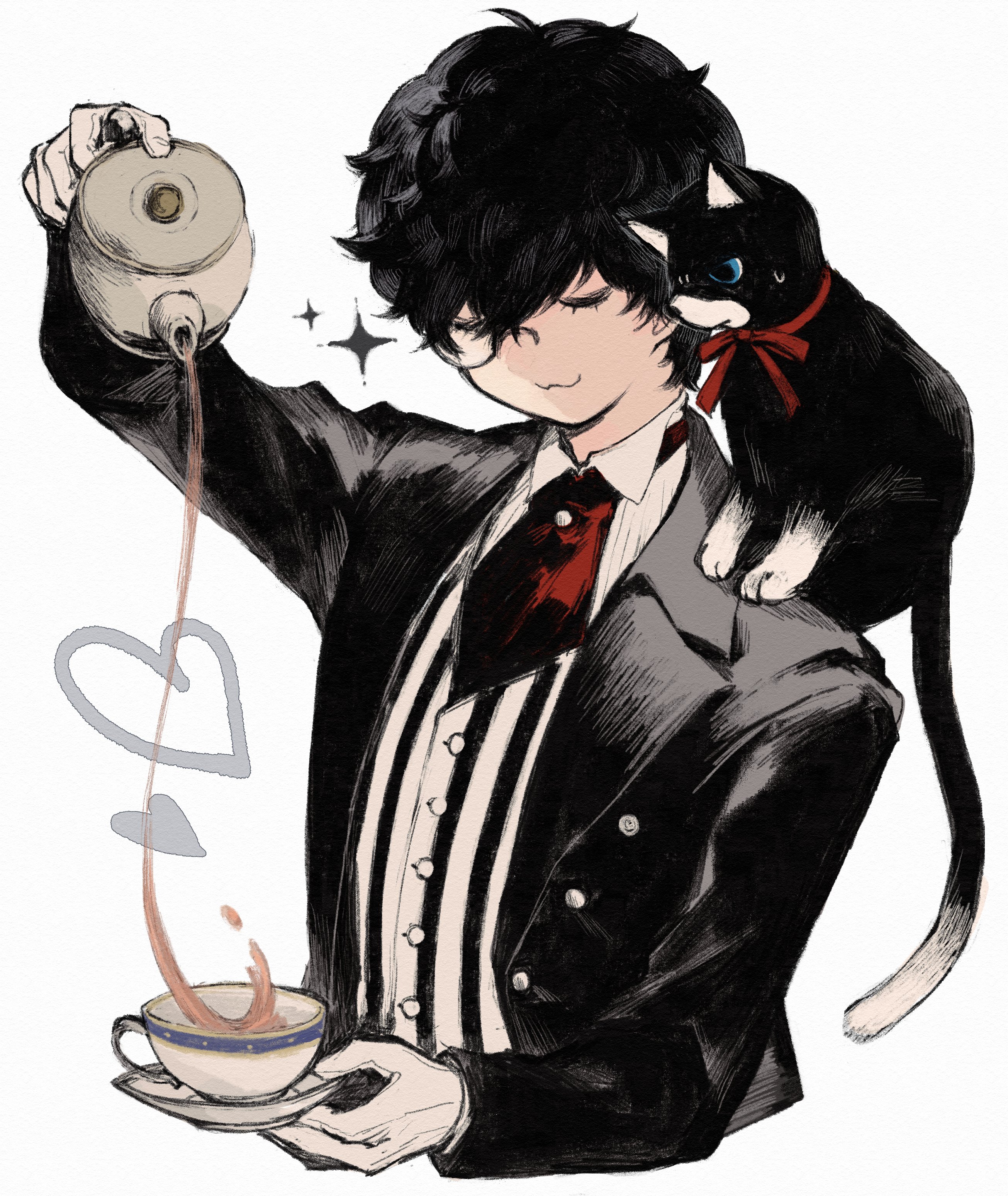 1boy :3 absurdres alternate_costume amamiya_ren animal animal_on_shoulder ascot black_cat black_hair black_jacket blue_eyes cat cat_on_shoulder closed_eyes collared_shirt cup gloves heart highres holding holding_saucer holding_teapot jacket long_sleeves male_focus monocle morgana_(cat)_(persona_5) morgana_(persona_5) persona persona_5 pouring red_ascot saichuu_(more1208) saucer shirt simple_background sparkle suspenders sweat tea teacup teapot upper_body white_gloves white_shirt