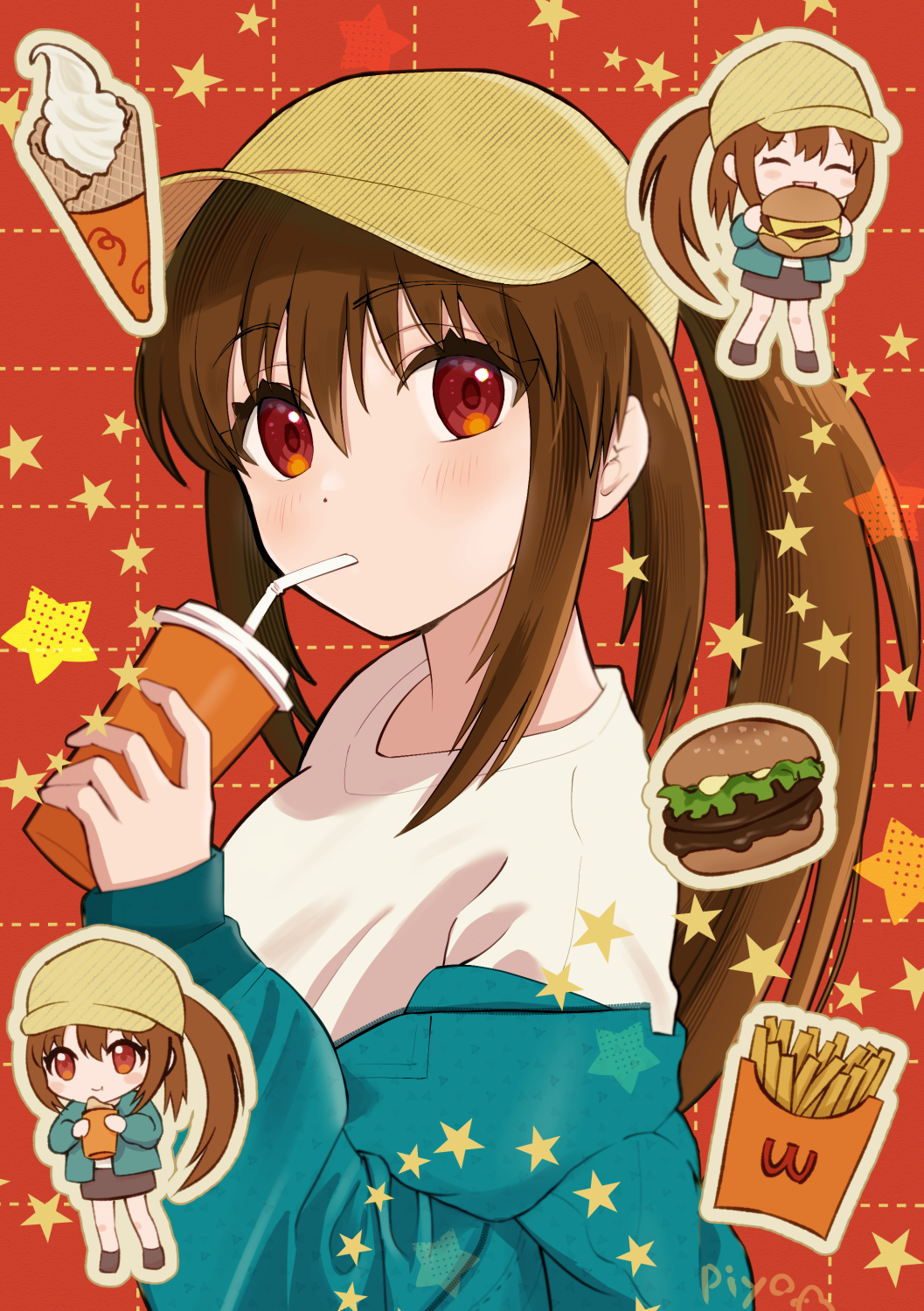 1girl ^_^ alternate_costume aqua_jacket blush brown_hair burger casual chibi chibi_inset closed_eyes closed_mouth commentary cup disposable_cup expressionless eyelashes eyes_visible_through_hair food french_fries hair_between_eyes happy hat highres holding holding_cup holding_food ice_cream jacket little_busters! long_hair long_sleeves looking_at_viewer natsume_rin peaked_cap piyo_(kinkooo333) ponytail red_background red_eyes shirt sidelocks simple_background sleeves_past_wrists smile solo star_(symbol) upper_body white_shirt yellow_hat