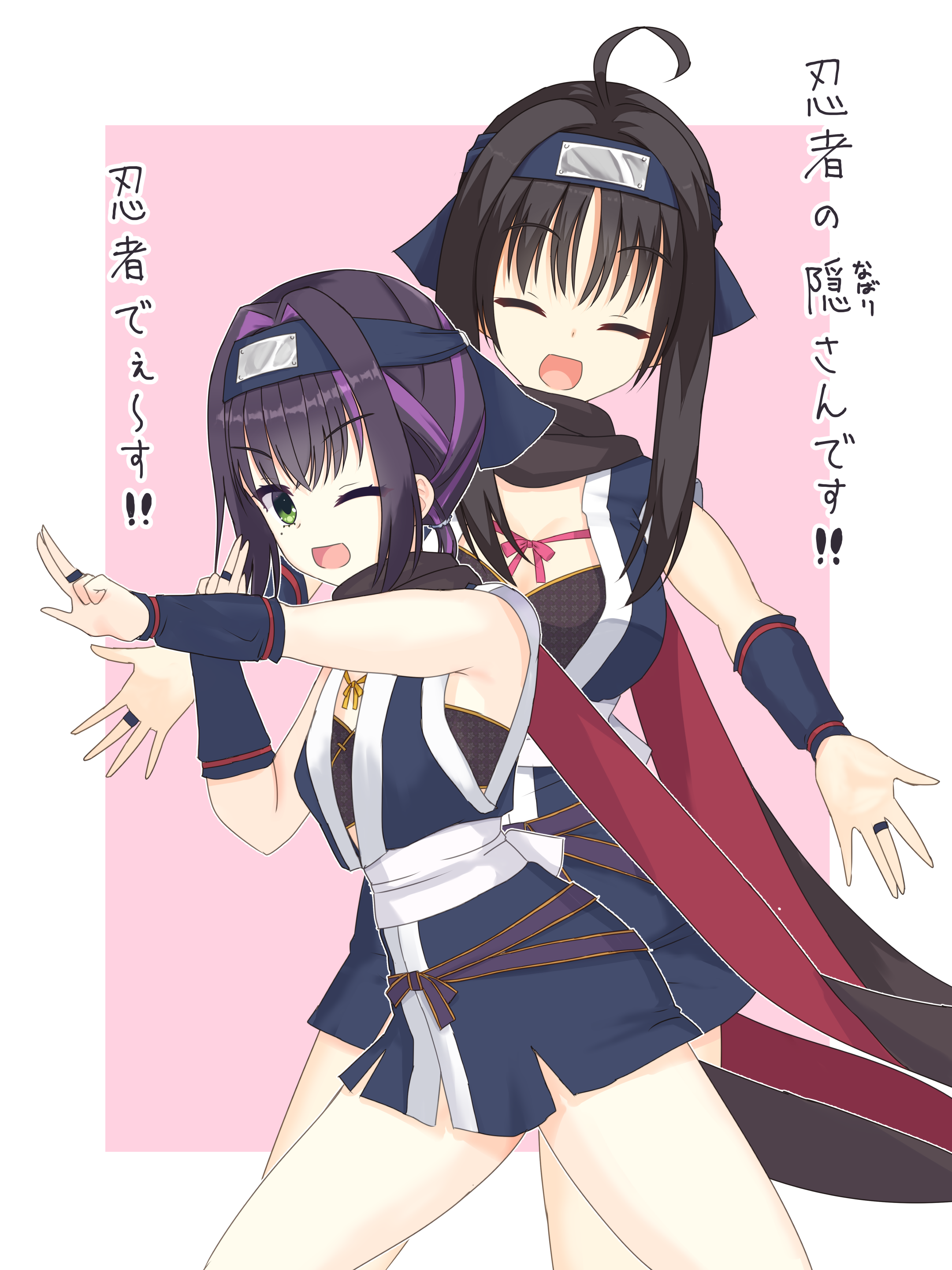2girls ;d \||/ ^_^ absurdres ahoge armor black_hair black_scarf blue_bridal_gauntlets blue_kimono border bow breastplate breasts bridal_gauntlets closed_eyes commentary_request company_connection cosplay cowboy_shot crossed_bangs crossover facing_viewer fighting_stance forehead_protector green_eyes hair_between_eyes hair_intakes hands_up highres hitachi_mako hitachi_mako_(cosplay) japanese_clothes kimono kuji-in large_breasts limelight_lemonade_jam long_scarf looking_at_viewer medium_hair mole mole_under_eye multicolored_hair multiple_girls nabari_anju ninja one_eye_closed open_mouth outline outside_border pink_background pink_bow purple_streaks red_scarf scarf senren_banka shirayamakoma short_hair_with_long_locks sidelocks simple_background sleeveless sleeveless_kimono small_breasts smile standing streaked_hair translation_request two-sided_scarf v-shaped_eyebrows white_border white_outline yuzusoft