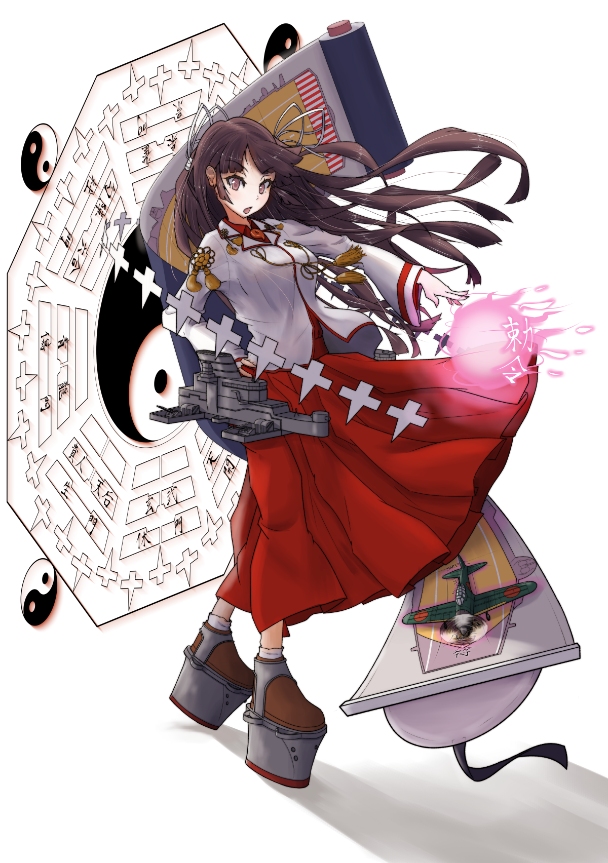 1girl aircraft airplane black_hair breasts brown_eyes brown_hair commentary_request hair_ribbon hand_on_own_hip highres hiyou_(kancolle) japanese_clothes kantai_collection ketumaru_spp long_hair long_sleeves looking_at_viewer magatama onmyouji open_mouth orb ribbon rigging scroll shikigami simple_background solo standing tassel white_background white_ribbon yin_yang yin_yang_orb