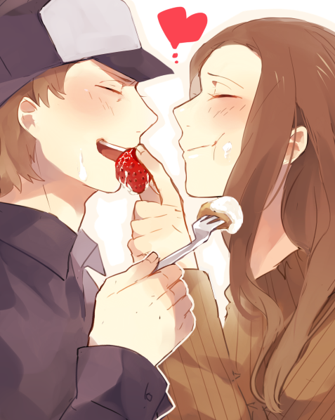 2boys baseball_cap black_shirt blush bo_sinclair brothers brown_hair brown_sweater chewing commentary_request food fork fruit hat holding holding_fork house_of_wax_(2005_movie) incest long_sleeves male_focus multiple_boys sharing_food shirt siblings strawberry sweater twins vincent_sinclair wakuji yaoi