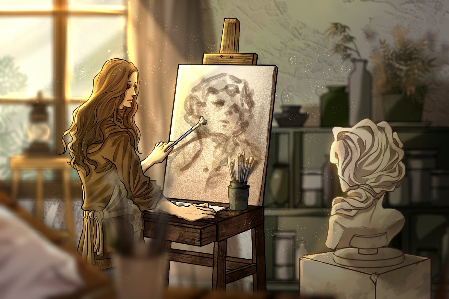 1boy apron blurry blurry_foreground brown_hair brown_sweater bust_(sculpture) closed_mouth commentary_request cup easel house_of_wax_(2005_movie) indoors lantern light_particles long_hair male_focus painting_(action) shadiaoxiaobai shelf sweater vincent_sinclair window